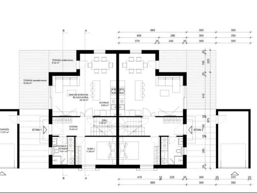 U mirnom djelu Podsuseda u početnoj je fazi gradnja dviju modernih duplex kuća, svaka sa dva identična dvoetažna stana. Kuće se grade u velikopanelnoj tehnologiji drvene konstrukcije, niske su energetske potrošnje klase A sa pametnim sustavima upravljanja i dizalicom topline za podno grijanje te klima uređajima. Prizemlje se sastoji od ulaznog hodnika, kuhinje sa izbom, blagavaonice i dnevnog boravka sa izlazima na terase te jedne spavaće sobe i jedne kupaonice. Na katu se nalaze 3 spavaće sobe od kojih dvije imaju izlaz na natkrivenu terasu te dvije kupaonice. Svakom stanu pripada jedna garaža, a svaki od 4 stana će imati cca 500 m2 zelene površine okućnice. cijena (stana) kuće je 425 000 eura sa Pdv-om, KUPAC NE PLAČA AGENCIJSKU PROVIZIJU. Planirani rok završetka kuća je jesen 2026 Opis kuće : Temelji : protupotresna AB ploča Koja se još koristi kod pasivnih kuća, Vanjska stolarija je drvo aluminij Švedski proizvođač Nor-dan black line sa troslojnim staklima i vanjskim aluminijskim žaluzinama. Fasada, demit sa eps 12 cm debljine proizvođača Weber. Krov, rogovi 22 cm visine sa izolacijama i pokrov od Jungmeier glaziranog crijepa. Podovi Bjelin parketi, keramika prvoklasna gres od MARINER. Grijanje podno sa toplinskom pumpom a hlađenje putem klima jedinica. U cijeni je zemlja sve dozvole dokumentacija, gradnja, završno uređenje eksterijera i interijera, tehnički pregled i upis kuće u ZK U cijeni nije namještaj, garaža, uređenje okoliša, svi vanjski radovi kao ograde, trijem, decking i roštilj nisu u cijeni te se trebaju dogovoriti po želji.