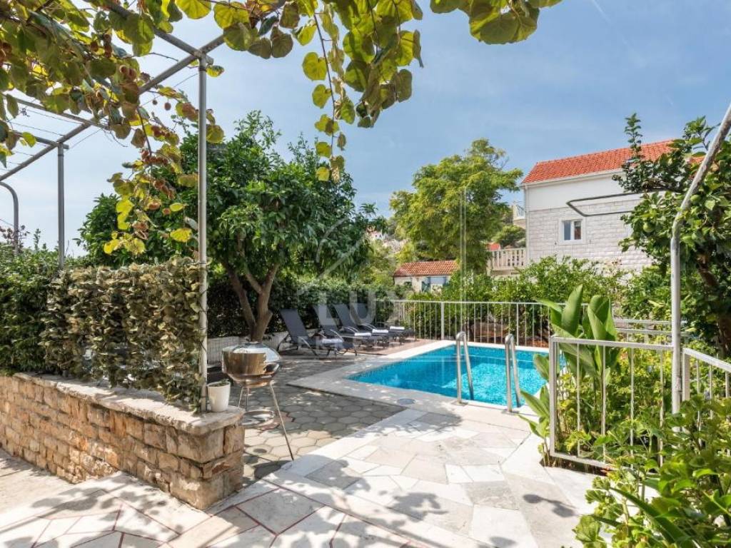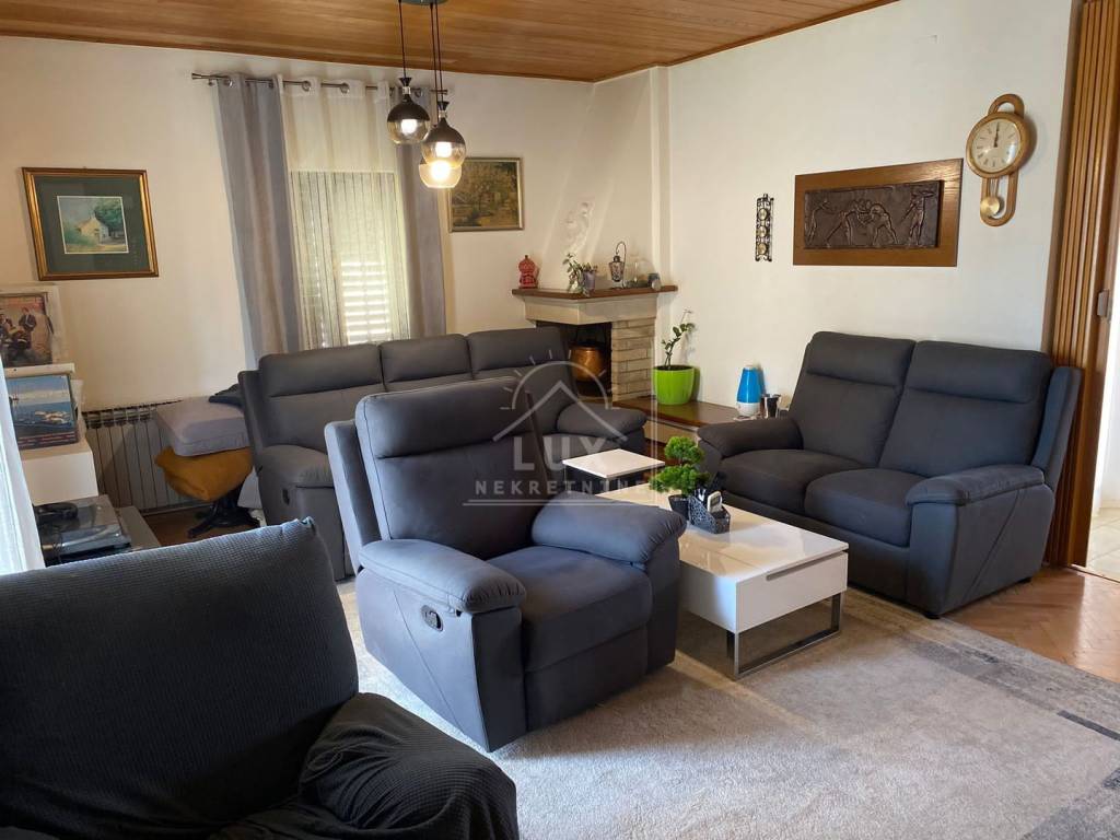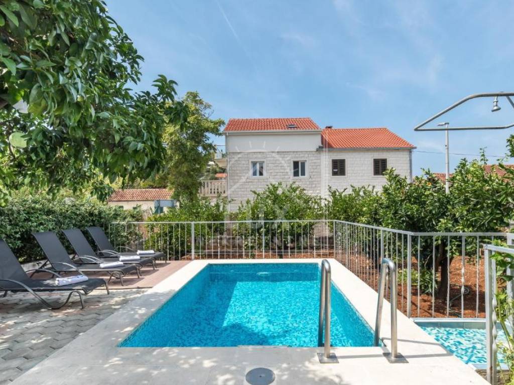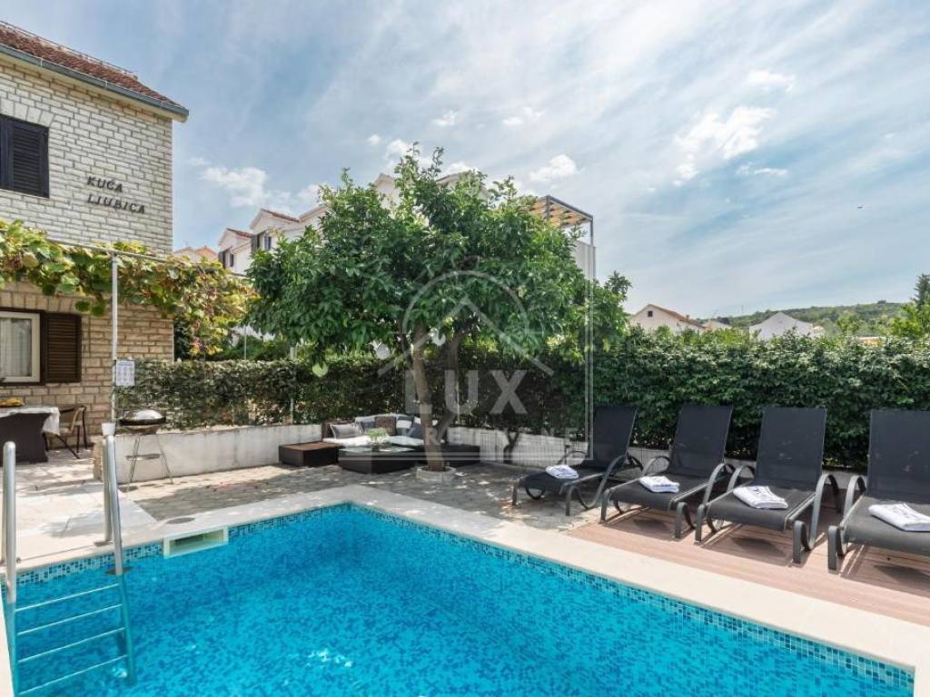 Kuća sadrži: odvojen apartman u prizemlju s vlastitim bazenom (dimenzija 2.50 x 4 m) i terasom, koji se trenutno turistički iznajmljuje, veliki stan na prvom katu s prostranim dnevnim boravkom i balkonima, potkrovlje s mogućnošću uređenja u dodatnu stambenu jedinicu, okućnicu s mediteranskim voćkama i visokim stupnjem privatnosti, garažu s dva parkirna mjesta, konobu i spremište.