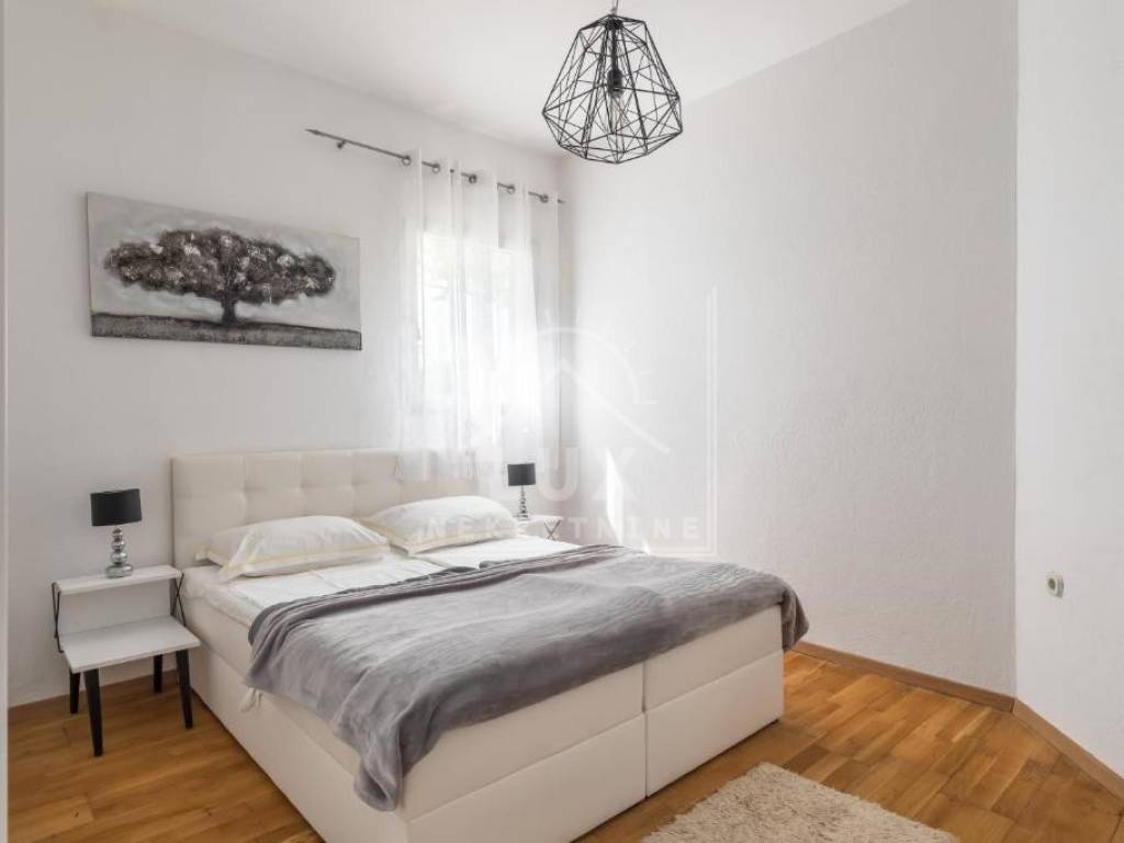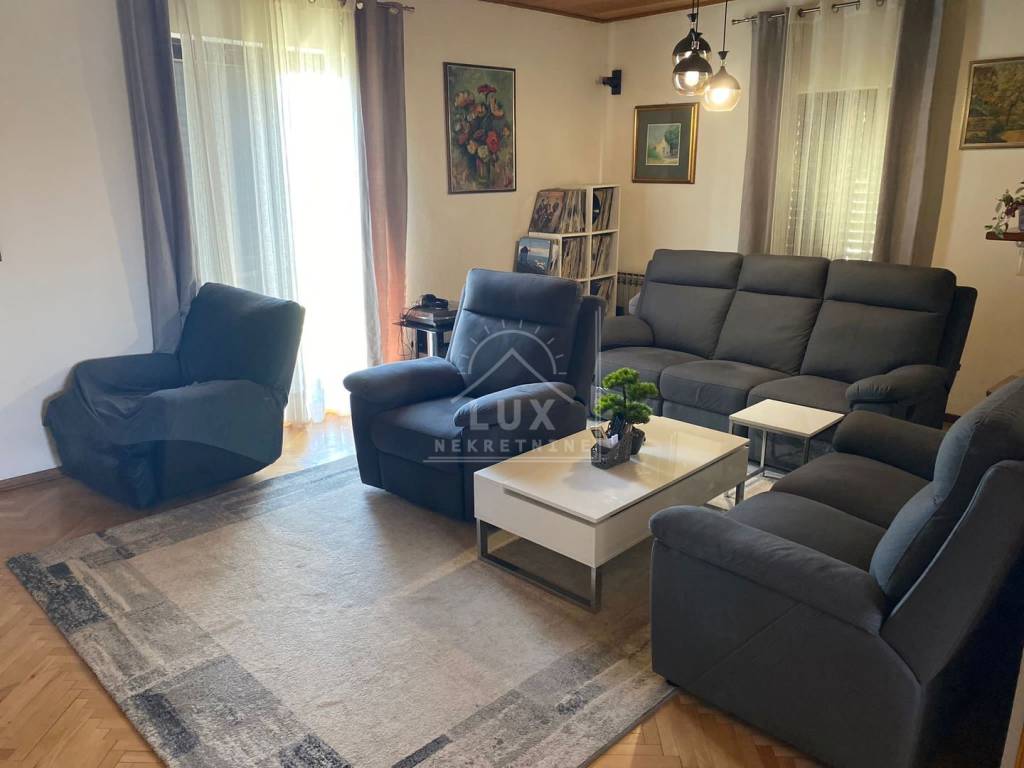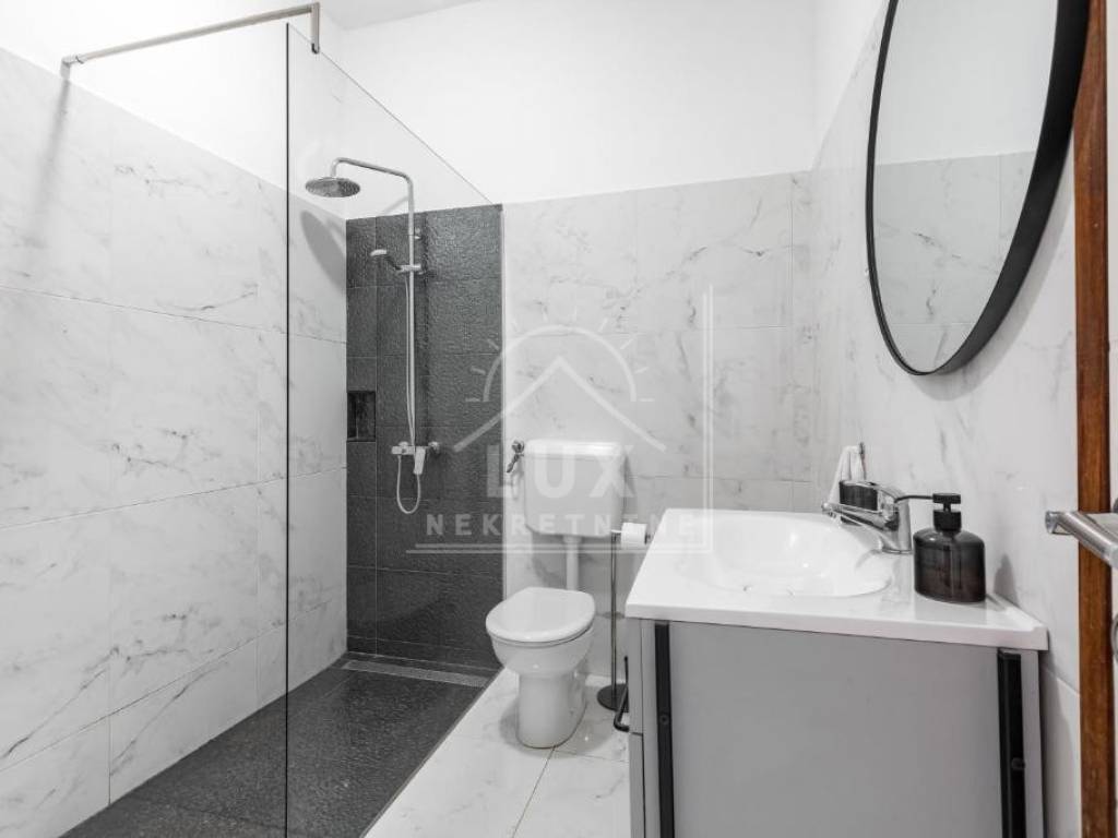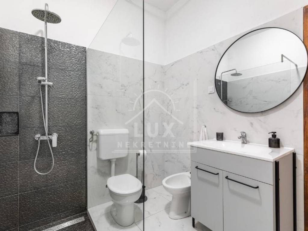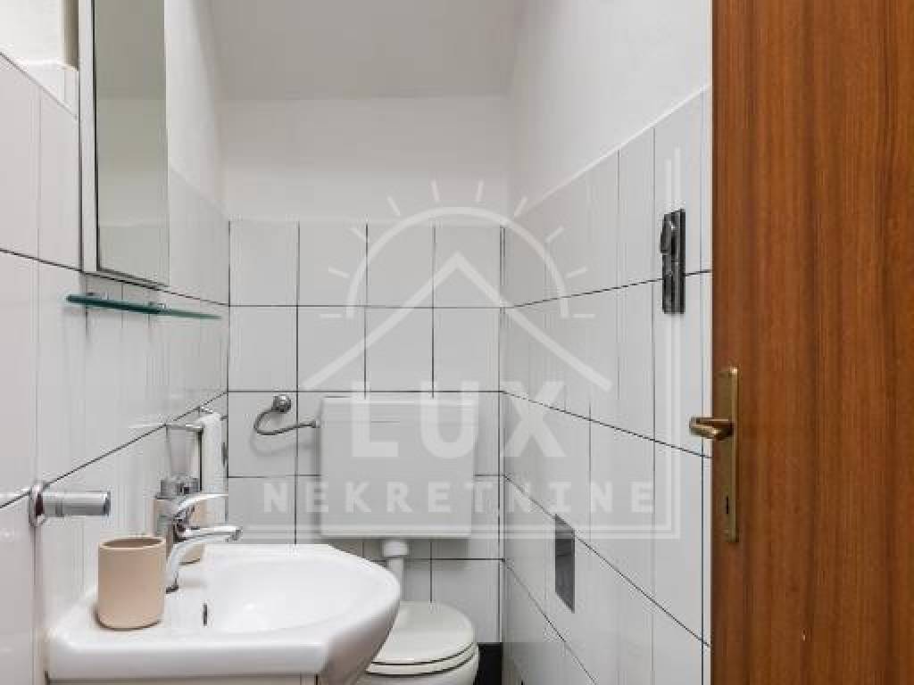 Kuća sadrži: odvojen apartman u prizemlju s vlastitim bazenom (dimenzija 2.50 x 4 m) i terasom, koji se trenutno turistički iznajmljuje, veliki stan na prvom katu s prostranim dnevnim boravkom i balkonima, potkrovlje s mogućnošću uređenja u dodatnu stambenu jedinicu, okućnicu s mediteranskim voćkama i visokim stupnjem privatnosti, garažu s dva parkirna mjesta, konobu i spremište.