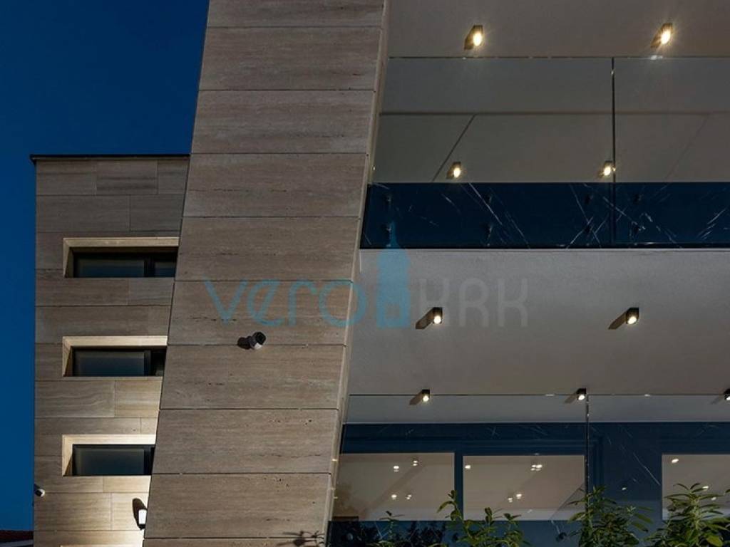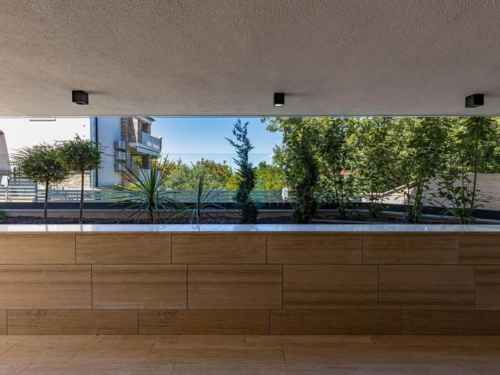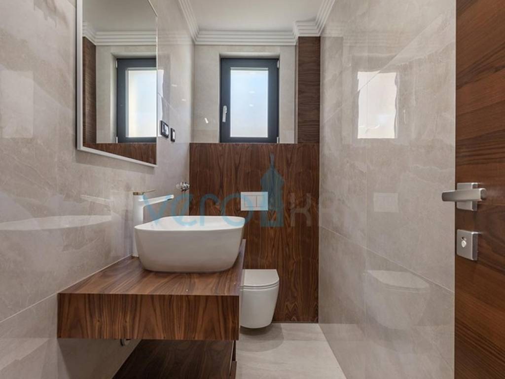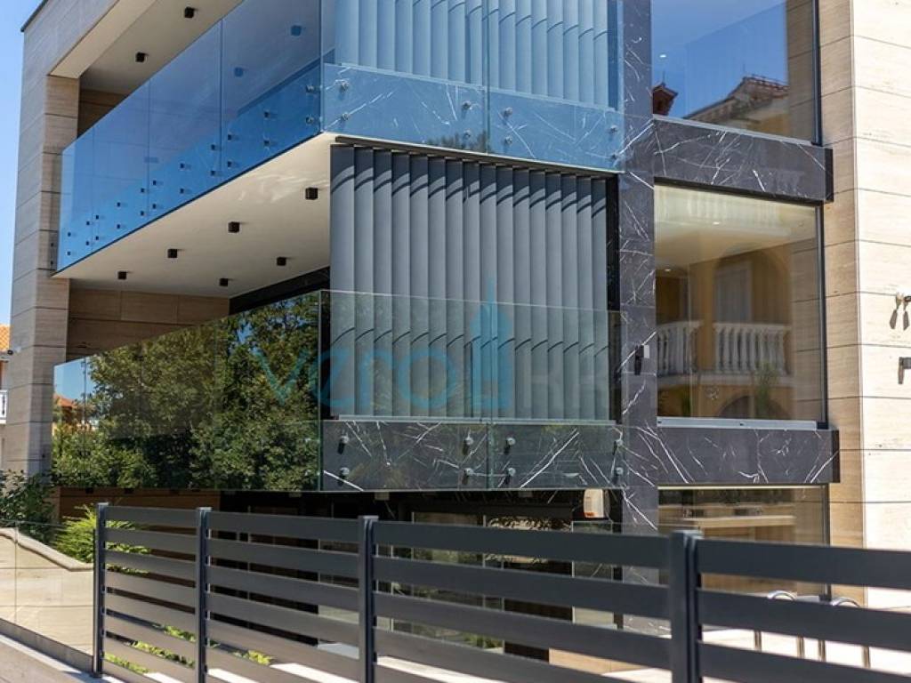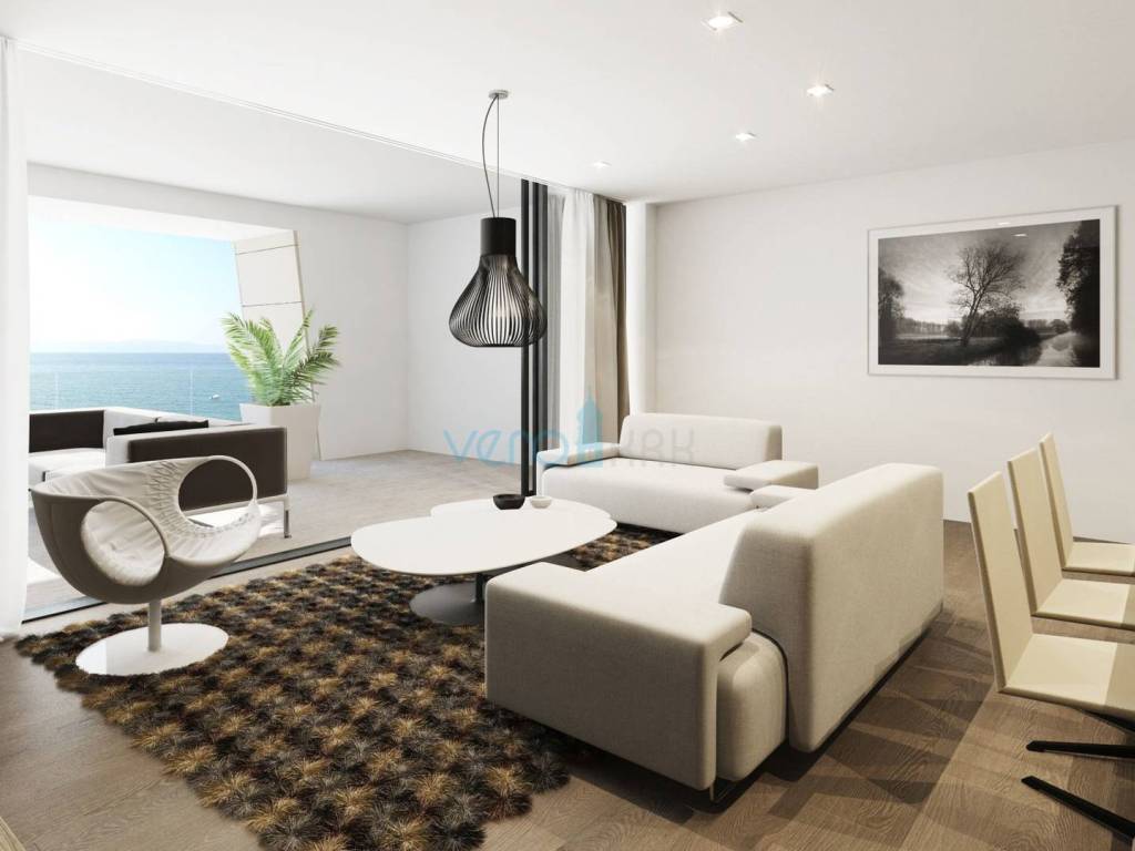 Malinska, na 150m do mora, nalazi se unikatno uređen luksuzni stan 100,38 m2 u vprizemlju moderne zgrade sa tri stana, sastoji se od otvorenog dnevnog boravka sa kuhinjom i blagovaonicom, dvije prostrane spavaće sobe, kupaonice. Iz dnevnog boravka je izlaz na terasu od 27 m2. Ovom stanu pripada dio okućnice od 102 m2 na kojem se nalazi bazen od 15 m2 te dva parkirna mjesta od 27,50 m2. Kroz cijeli stan je provedeno podno grijanje, dok je hlađenje hlađenje mitsubishi parapetnim unutarnjim jedinicama u svakoj prostoriji. Podne obloge su od porculanske keramike, spušteni stropovi sa ugrađenom rasvjetom, unutarnja stolarija orah drvo talijanskog proizvođača Diere, vanjska stolarija stolarija su velike podizno klizne stijene. Konstrukcija zgrade je armirani beton, fasada objekta je od ventilirajućeg rimskog kamena Travertin, dok su ulazna vrata u zgradu od poznatog proizvođača Inoterm.