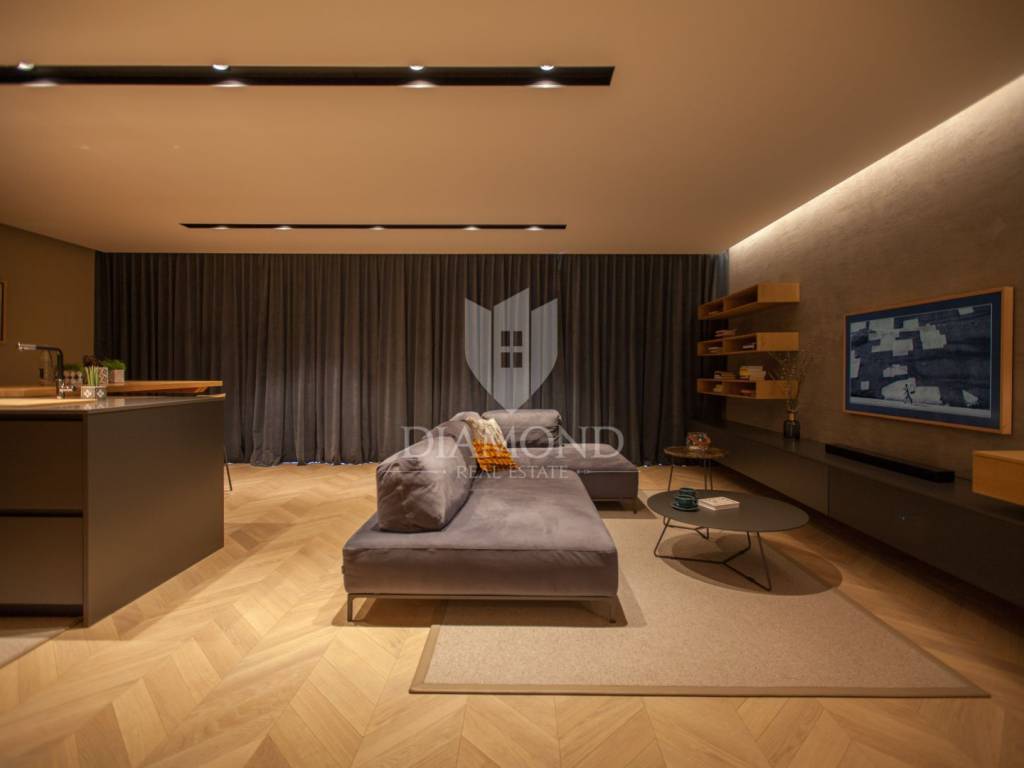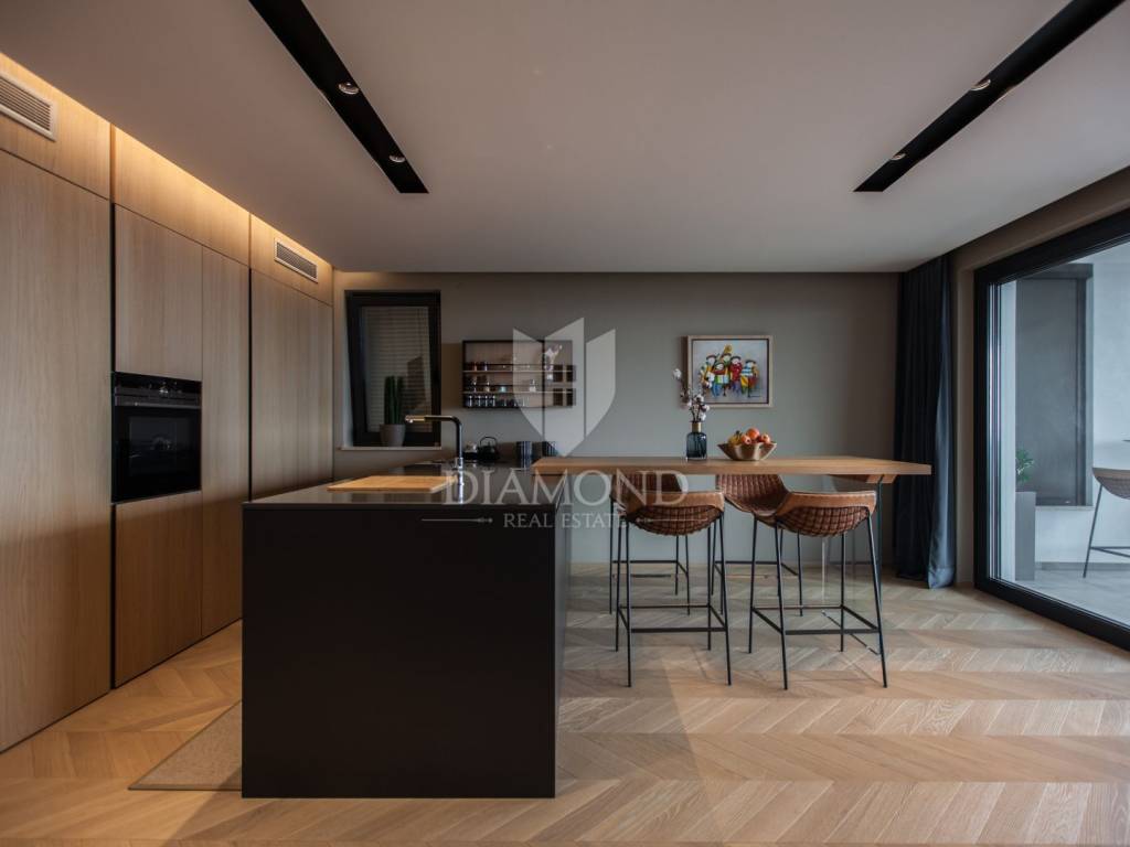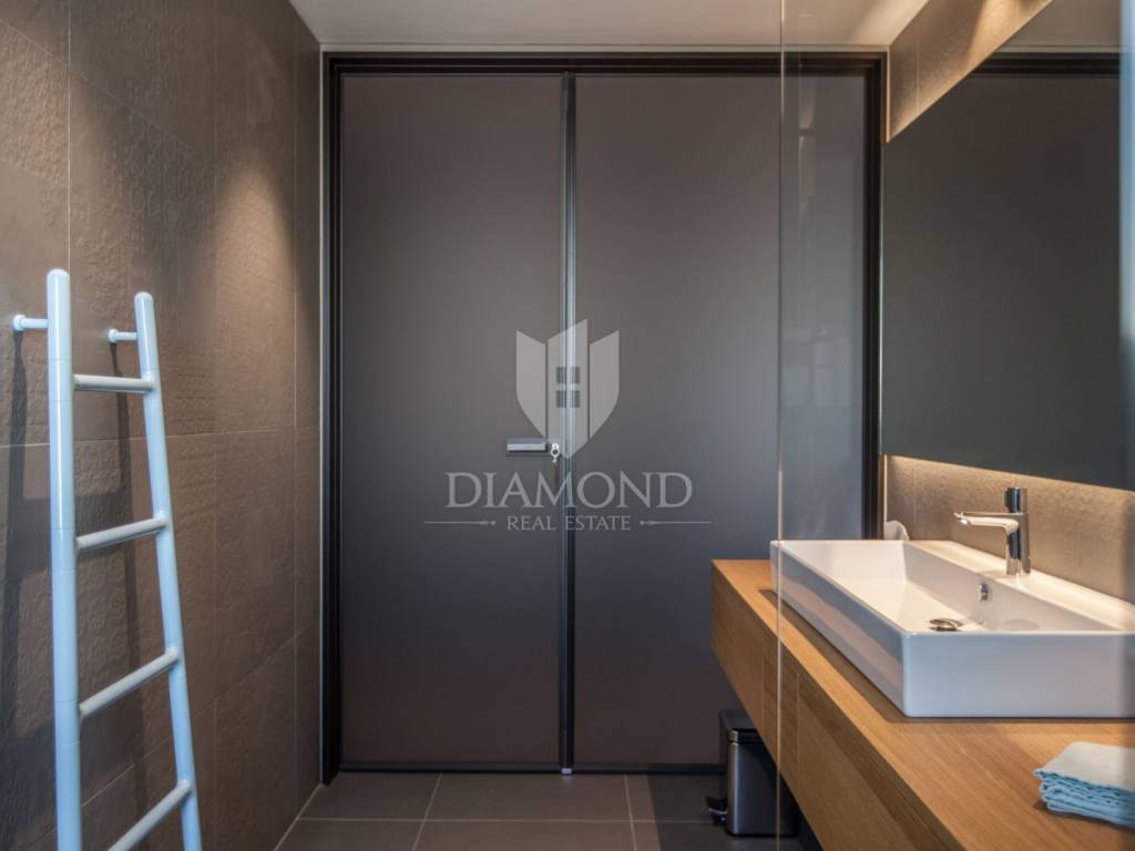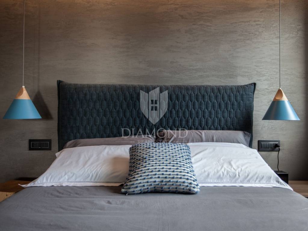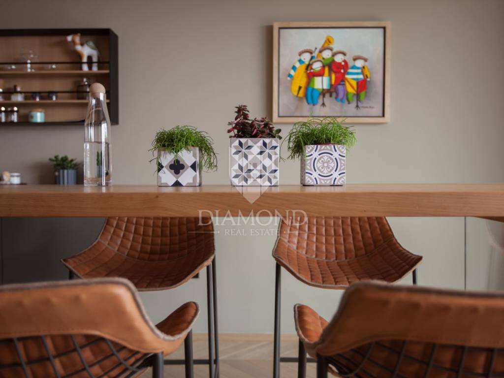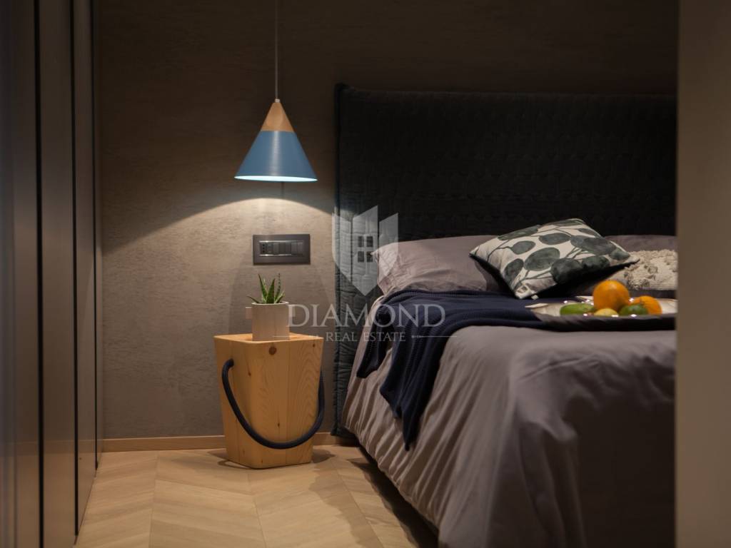Prodaje se moderan, potpuno namješten stan s prekrasnim pogledom na more i grad Novigrad, smješten na mirnoj i atraktivnoj lokaciji, svega nekoliko minuta hoda od centra i oko 1000 metara od mora i uređenih plaža. Stan se nalazi na drugom katu zgrade iz 2017. godine, površine 85 m², s prostranom natkrivenom terasom od 25 m² koja uključuje ljetnu kuhinju izrađenu od Dekton Kelya materijala i dvije električne tende marke Gibus s daljinskim upravljanjem.