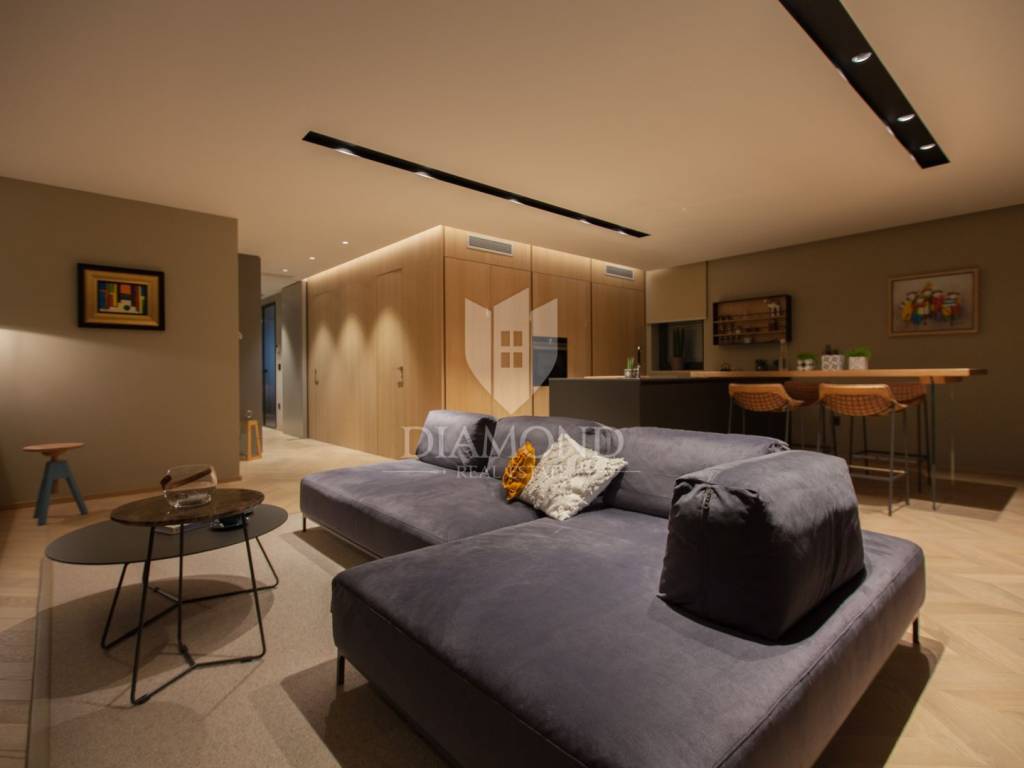 Stan se sastoji od dvije spavaće sobe, dnevnog boravka, kuhinje Arrital, kupaonice s kadom i dodatnog WC-a. U potpunosti je opremljen talijanskim namještajem rađenim po mjeri (osim dječjih ormara i opreme na terasi). Opremljen je aluminijskim prozorima, električnim roletama na tipkalo, dizalicom topline, podnim grijanjem te stropnim hlađenjem i grijanjem putem kanalnih sustava nevidljivo integriranih u strop. Sustav grijanja i hlađenja omogućuje ugodnu temperaturu tijekom cijele godine uz maksimalnu energetsku učinkovitost.