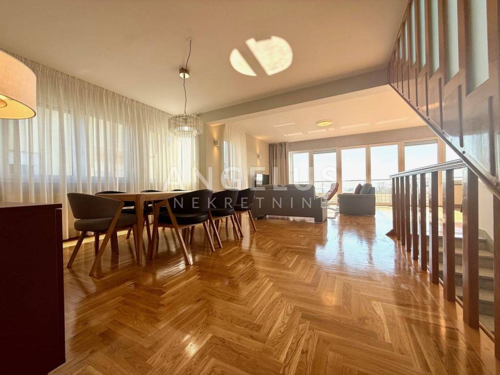 Na katu je veliki dnevni boravak s blagovaonicom i izlazom na terasu, kompletno opremljena kuhinja, toalet i još jedna soba koja može biti radna ili spavaća jer je dovoljno velika.