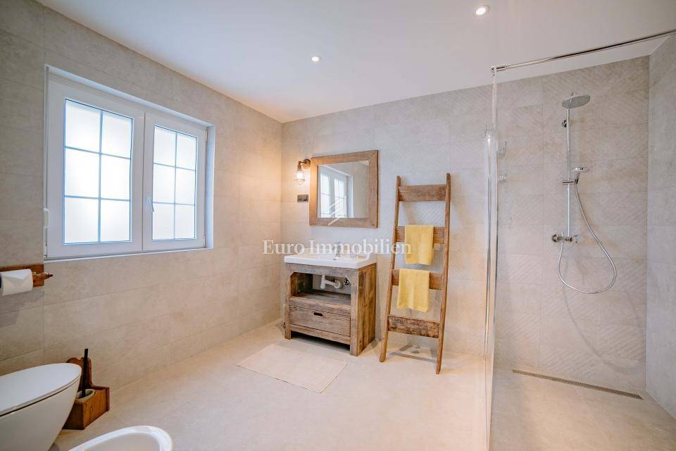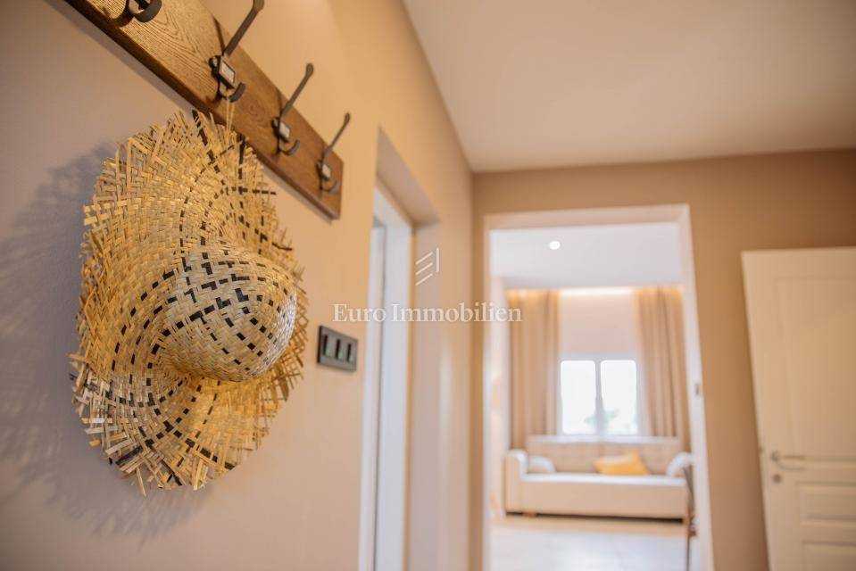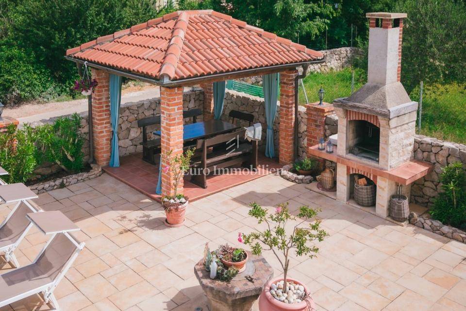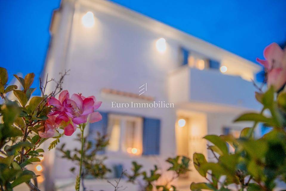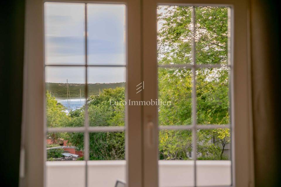 Prodaje se lijepa samostojeća kuća s pogledom na more i bazenom u uvali Soline na otoku Krku. Kuća površine 200 m2 proteže se na prizemlje i kat. U prizemlju se nalaze tri spavaće sobe, kupaonica, hodnik, kuhinja s blagovaonicom, dnevni boravak s izlazom na natkrivenu terasu. Vanjskim stepenicama dolazi se na prvi kat koji ima dva ulaza, na svakom su po jedna soba s kupaonicom i balkonom. Ima i konobu 4 x 4,50. Ugrađeni su električni norveški radijatori i klime uređaji. Na lijepo uređenoj okućnici nalazi se sjenica, roštilj, bazen i sunčalište.