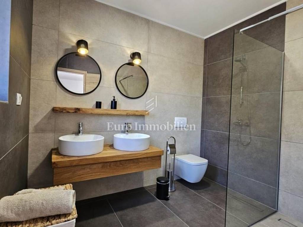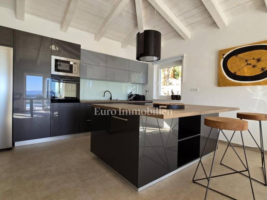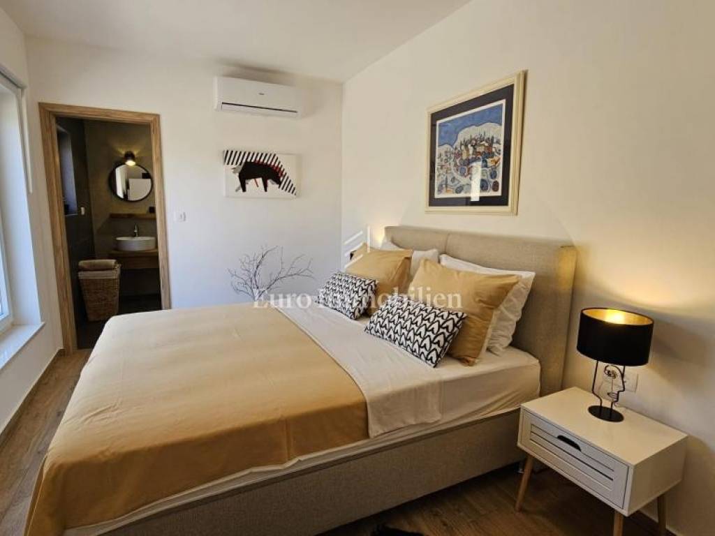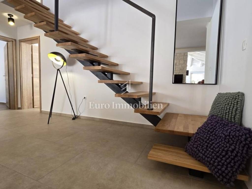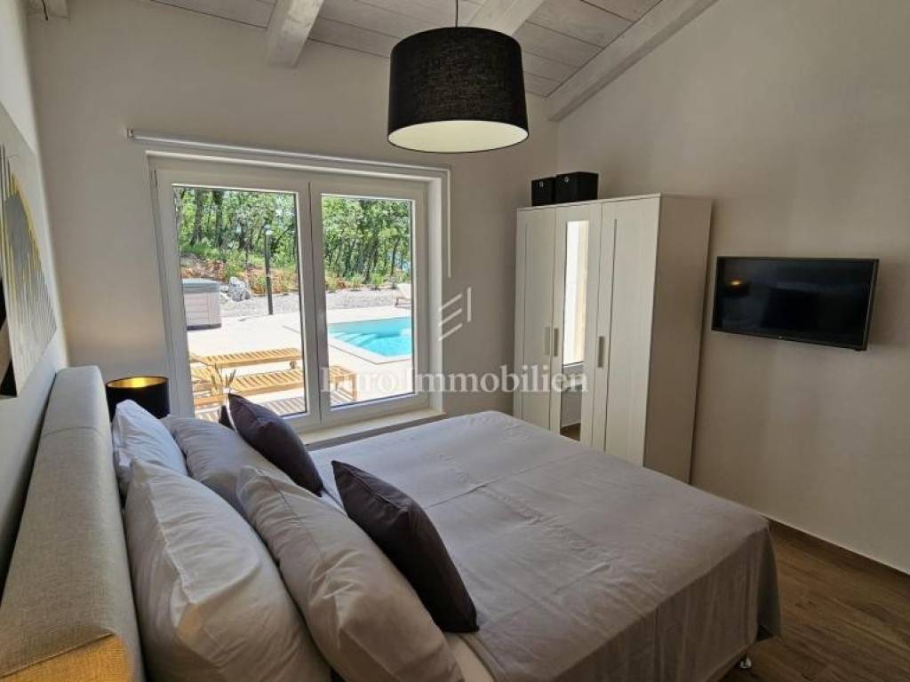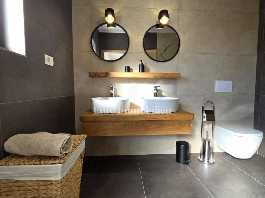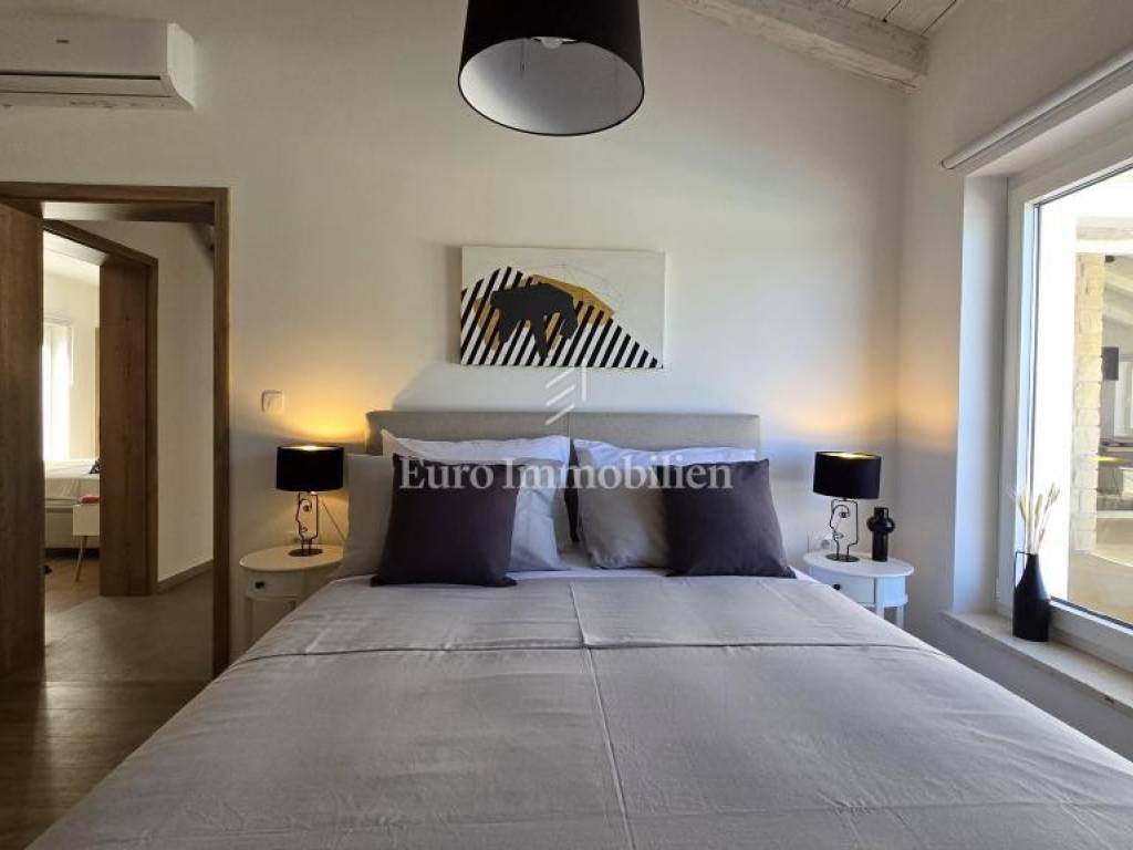 Prodaje se kamena villa rustikalnog stila, građena istarskim kamenom iz mjesta Kanfanar. Ima površinu 200 m2 + 36 m2 garaže + 10 m2 strojarnice + 35 m2 grijanog bazena s elektrolizom vode i postavljenom keramikom u bazenu, dok je ukupna površina zemljišta, koja je uređena autohtonim mediteranskim biljem, maslinama, prirodnim stijenama čak 1.200 m2. Smještena na jednoj od najljepših lokacija na Kvarneru, u mjestu Jadranovo, vila predstavlja savršen spoj tradicije i luksuza. Villa ima smještajni kapacitet za osam osoba i ima četiri spavaće sobe s ensuite kupaonicama. U prizemlju ville nalaze se dvije spavaće sobe, prostrani osvijetljeni dnevni boravak s dodatnim kaučem na razvlačenje za dvije osobe, te moderno opremljena kuhinja s blagovaonicom. Na gornjem se katu nalaze još dvije spavaće sobe s panoramskim pogledom na more. Čitav prostor je klimatiziran, ugrađena je dizalica topline (podno grijanje) i kamin. Na terasi popločanoj kamenom nalazi se prekrasni, keramikom obloženi grijani bazen s elektrolizom vode, veličine 35 m2 i dubine 1,7 m i hidromasažna kada (Jacuzzi) za 6 osoba, osam ležaljki za sunčanje s jastucima, vanjski stol za jelo od slavonskog hrasta, te vanjski zidani kameni roštilj. U potpuno ograđenom dvorištu ville na raspolaganju su i dva parkirna mjesta u garaži. Villa je smještena na izoliranoj lokaciji daleko od gradske buke, te je okružena prirodom. Najbliža plaža udaljena je 900 m.