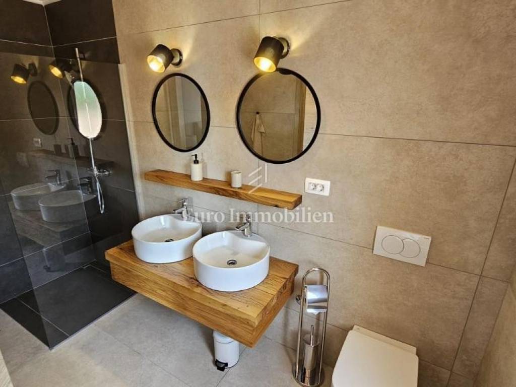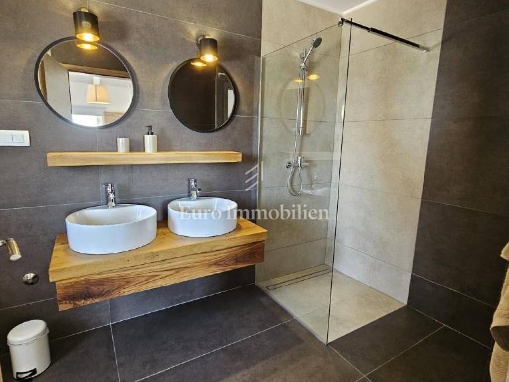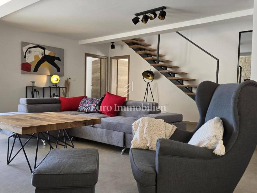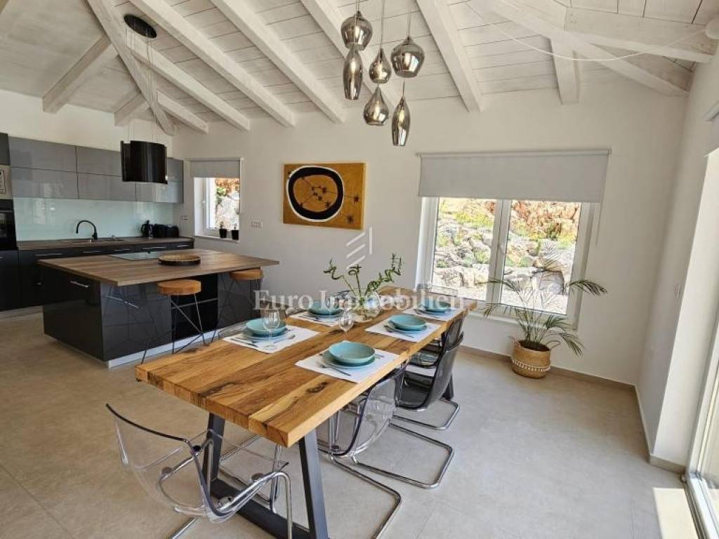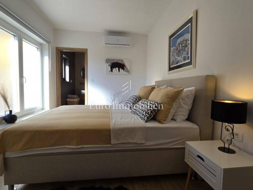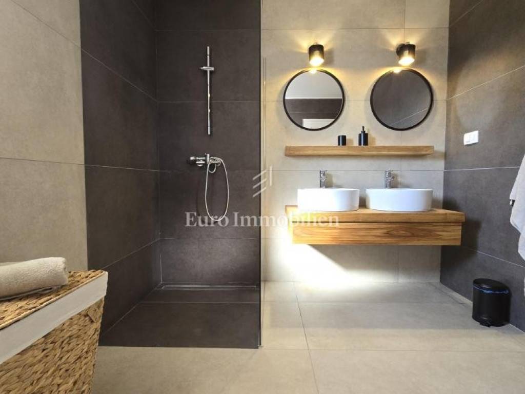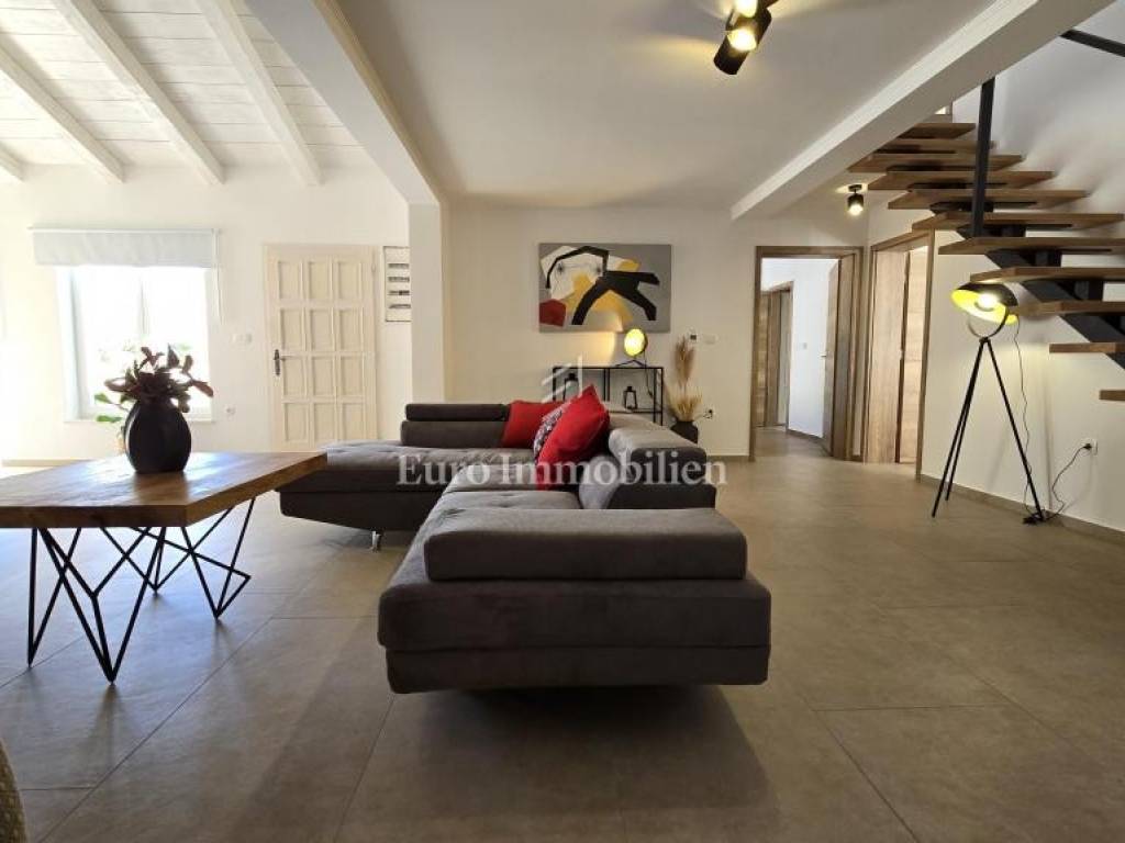 Prodaje se kamena villa rustikalnog stila, građena istarskim kamenom iz mjesta Kanfanar. Ima površinu 200 m2 + 36 m2 garaže + 10 m2 strojarnice + 35 m2 grijanog bazena s elektrolizom vode i postavljenom keramikom u bazenu, dok je ukupna površina zemljišta, koja je uređena autohtonim mediteranskim biljem, maslinama, prirodnim stijenama čak 1.200 m2. Smještena na jednoj od najljepših lokacija na Kvarneru, u mjestu Jadranovo, vila predstavlja savršen spoj tradicije i luksuza. Villa ima smještajni kapacitet za osam osoba i ima četiri spavaće sobe s ensuite kupaonicama. U prizemlju ville nalaze se dvije spavaće sobe, prostrani osvijetljeni dnevni boravak s dodatnim kaučem na razvlačenje za dvije osobe, te moderno opremljena kuhinja s blagovaonicom. Na gornjem se katu nalaze još dvije spavaće sobe s panoramskim pogledom na more. Čitav prostor je klimatiziran, ugrađena je dizalica topline (podno grijanje) i kamin. Na terasi popločanoj kamenom nalazi se prekrasni, keramikom obloženi grijani bazen s elektrolizom vode, veličine 35 m2 i dubine 1,7 m i hidromasažna kada (Jacuzzi) za 6 osoba, osam ležaljki za sunčanje s jastucima, vanjski stol za jelo od slavonskog hrasta, te vanjski zidani kameni roštilj. U potpuno ograđenom dvorištu ville na raspolaganju su i dva parkirna mjesta u garaži. Villa je smještena na izoliranoj lokaciji daleko od gradske buke, te je okružena prirodom. Najbliža plaža udaljena je 900 m.