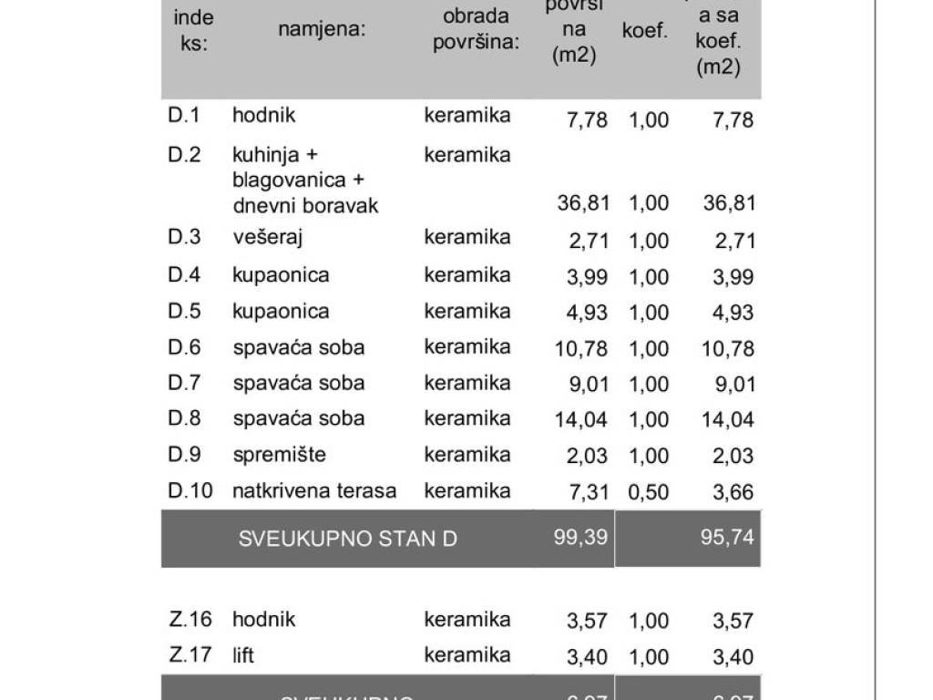 Penthouse ima neto stambenu površinu 95,74 m2, a ukupna reducirana površina s dva parkirna mjesta u garaži i spremištem iznosi 113,66 m2. Prostrani dnevni boravak s kuhinjom i blagovaonicom zauzima čak 37 m2, a raspored uključuje tri spavaće sobe, dvije kupaonice, vešeraj i natkrivena terasa.