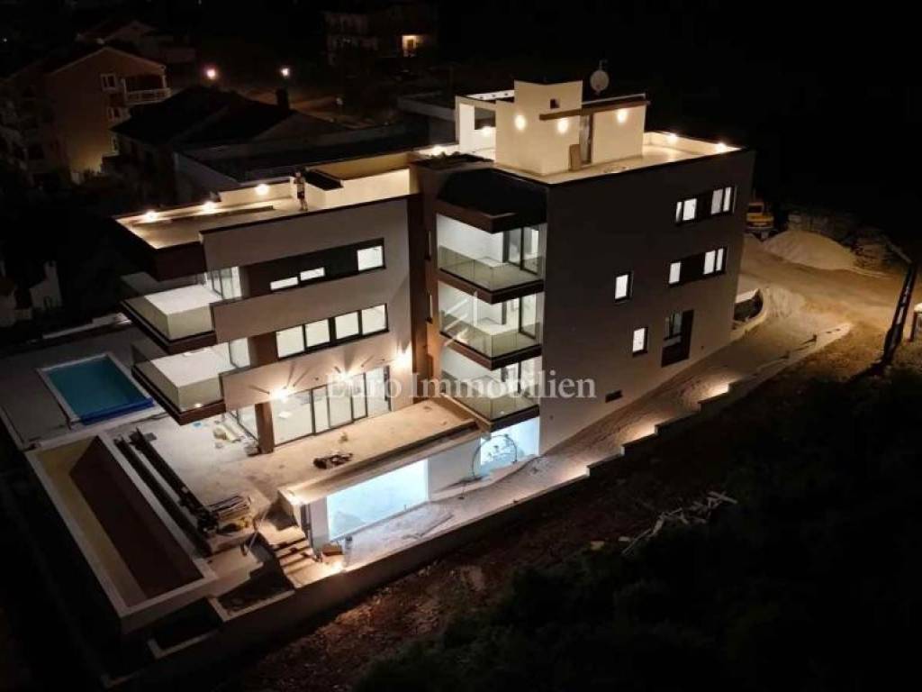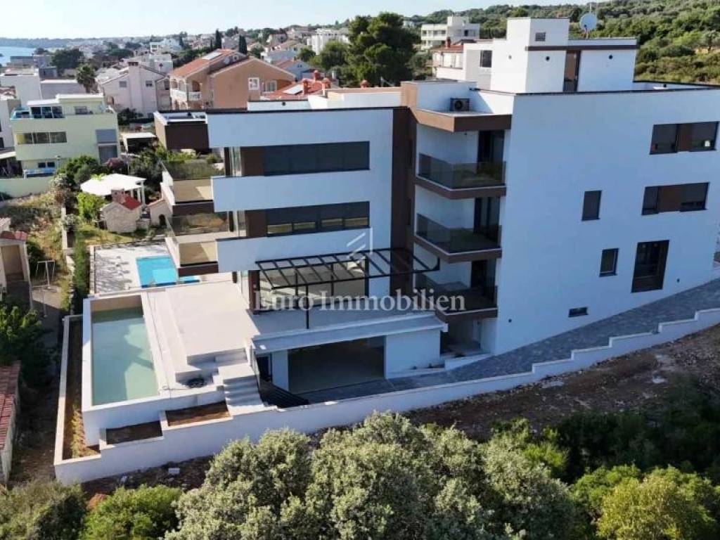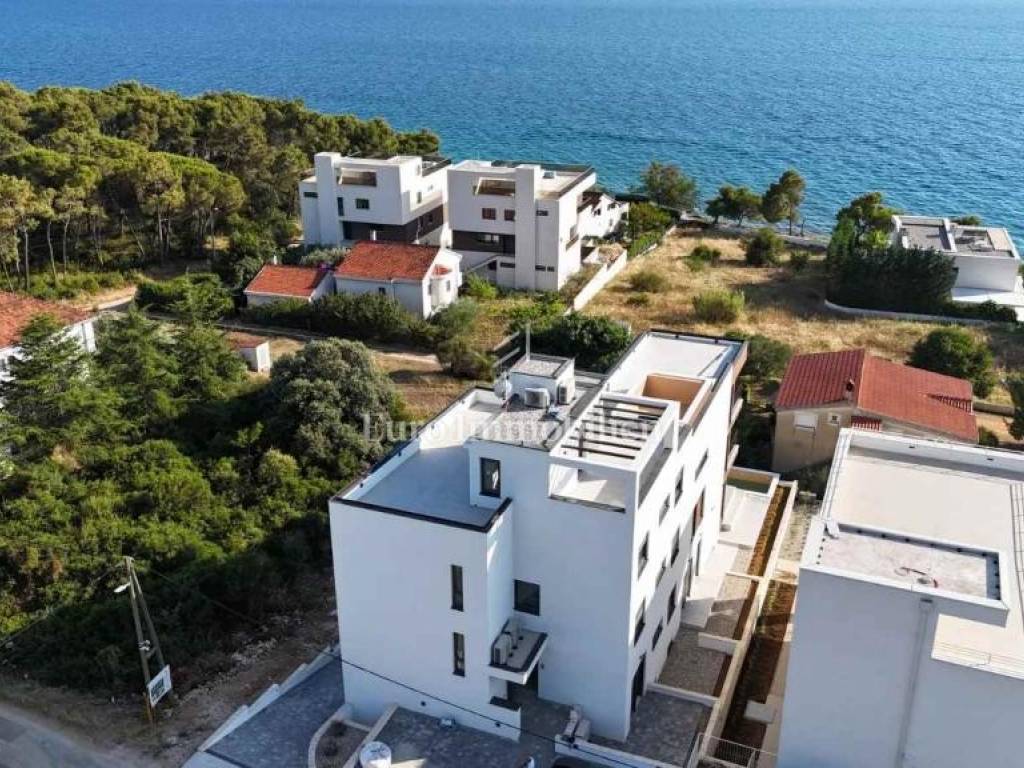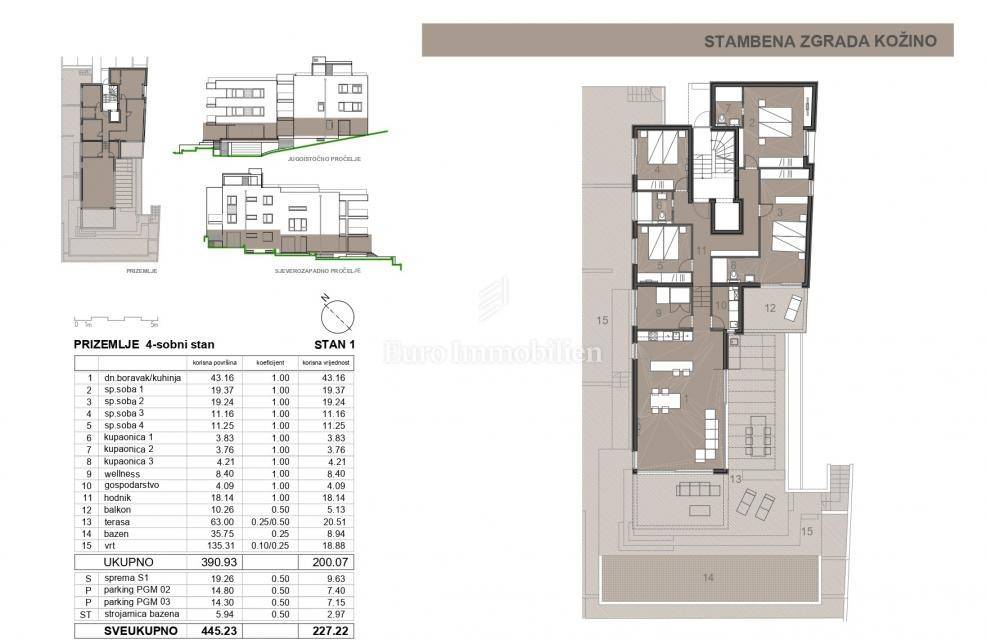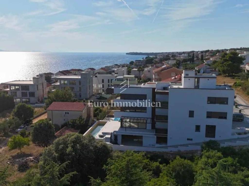 PRIZEMLJE - S1 se prostire preko cijele etaže i ima neto 227,22 m2. Sastoji se od 4 spavaće sobe, 3 kupaonice, gospodarstva, dnevnog boravka s blagovaonicom i kuhinjom, hodnika, wellnessa i vrta. S dvorištem apartman ukupno ima 404m2 površine. U dvorištu se nalazi velika terasa s pogledom na more, natkrivena pergolom i bazen 13x3 m koji ima grijanje i hlađenje. Apartmanu pripadaju 2 parkirališna mjesta u garaži i jedno mjesto ispred zgrade te spremište od 20 m2. Grijanje je podno preko dizalice topline, a svaka soba ima split klimatizacijsku jedinicu koja grije i hladi. Apartman će se prodavati namješten. - 913500 €