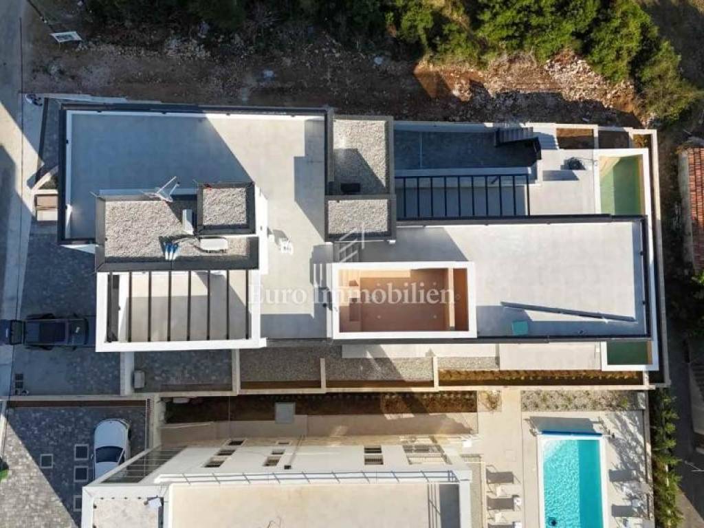 2. KAT - S4 se prostire preko cijele etaže i krovne terase, ima neto 265,06 m2, a ukupna korisna površina mu iznosi 404m2. Sastoji se od 4 spavaće sobe, 3 kupaonice, dnevnog boravka s blagovaonicom i kuhinjom, gospodarstva, hodnika te dvije terase s pogledom na more. Grijanje je podno preko dizalice topline, a svaka soba ima split klimatizacijsku jedinicu koja grije i hladi. Na krovnoj terasi nalazi se lounge prostor s pripremom za kućno kino, kuhinjsko-blagovaonski dio natkriven pergolom, sunčalište i infinity bazen 6x3 m grijan i hlađen. - 1319500 €