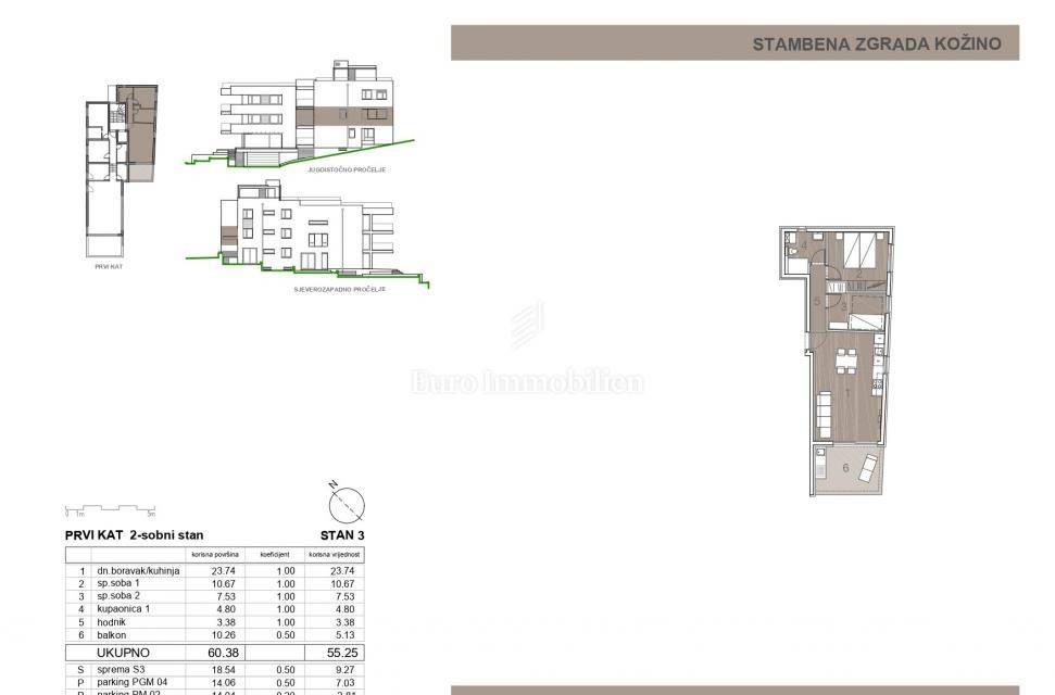 S3 ima neto 74.36 m2. Sastoji se od 2 spavaće sobe, kupaonice, dnevnog boravka s blagovaonicom i kuhinjom, hodnika te prekrasne terase s pogledom na more i pripremom za ljetnu kuhinju. Split klimatizacija u svakoj prostoriji za grijanje i hlađenje te podno grijanje na struju u kupaonici. Pripada mu jedno parkirališno mjesto u garaži i jedno mjesto ispred zgrade te spremište od 20 m2. - 355250 €