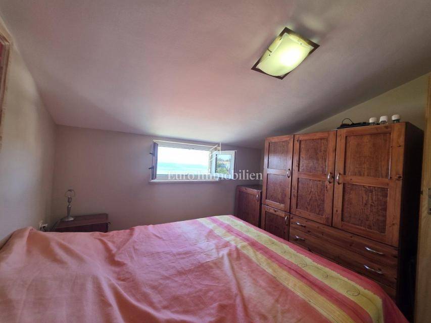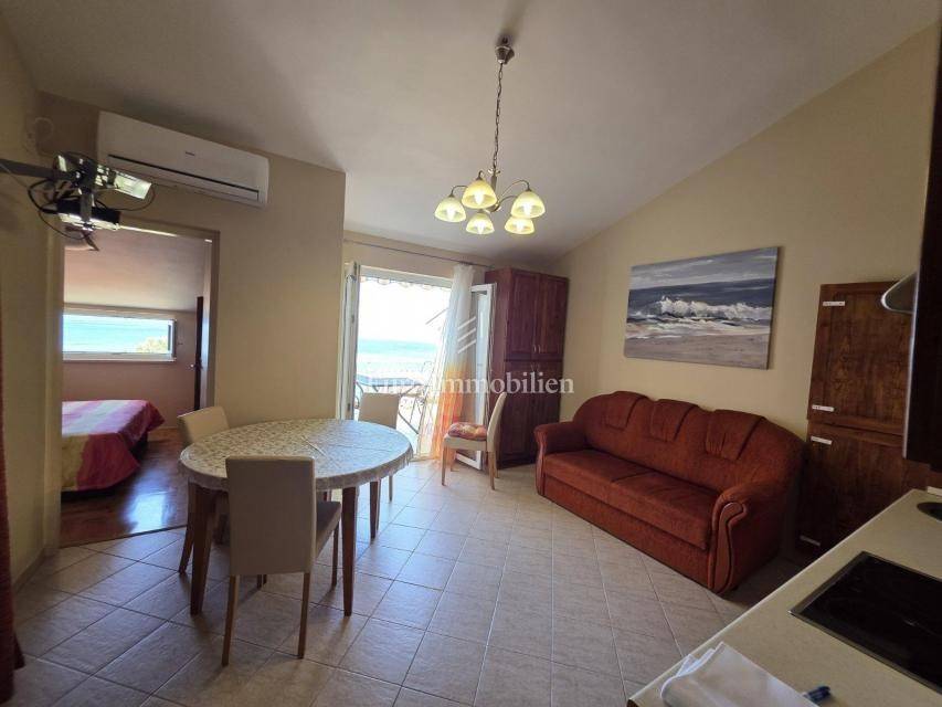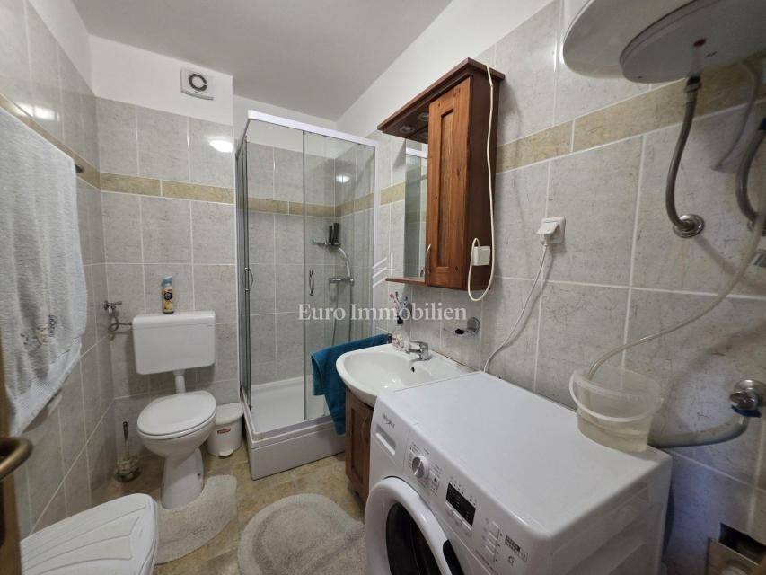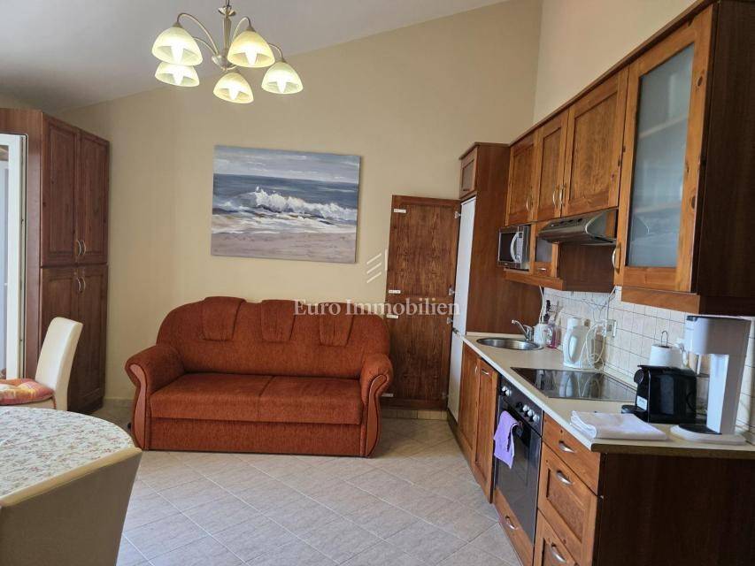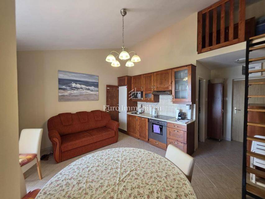 Stan s galerijom na samo 70m od mora s prekrasnim pogledom. Stan je površine 43.05 m2 i sastoji se od ulaznog hodnika, kuhinje s blagovaonicom, dnevnog boravka, spavaće sobe, galerije s dodatnim spavaćim prostorom i terase. Nekretnina se prodaje potpuno namještena i klimatizirana, spremna za korištenje. Parking unutar okućnice zgrade. Izvrsna lokacija blizu svih potrebnih sadržaja.