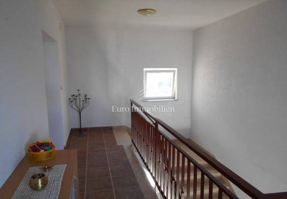 Na prvom katu nalazi se stambeni prostor površine 88m2 trenutno uređen kao ulazni hodnik, kupaonica, dodatni wc, spavaća soba te otvoreni prostor kuhinje s blagovaonom i dnevnim boravkom. Ova etaža ima veliku nenatkrivenu terasu površine 98m2.