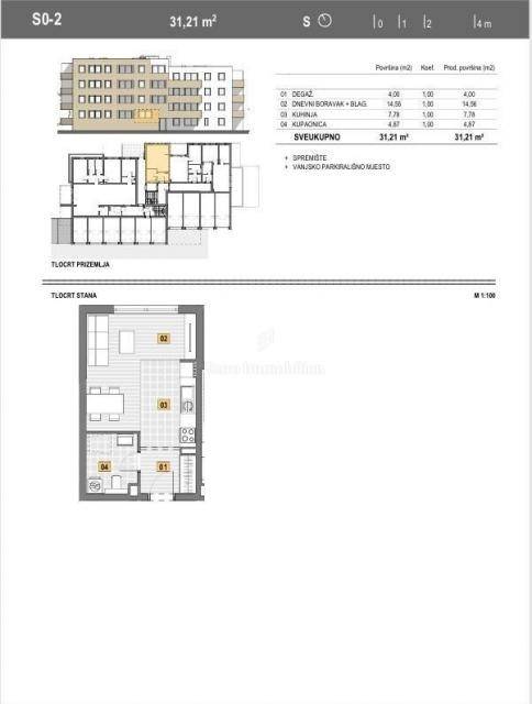 Predmetni stan ima površinu 31,21 m2 i koncipiran je kao garsonijera s pripadajućim vanjskim parkirnim mjestom i spremištem.