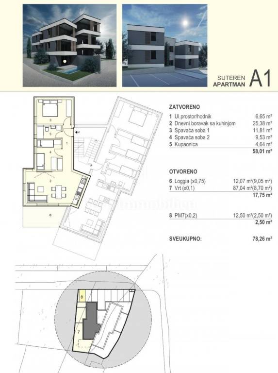 SUTEREN - A1 (ulazni prostor / hodnik, dnevni boravak + kuhinja, dvije spavaće sobe, kupaonica, lođa, vrt, parkirno mjesto) - 78,26 m² - 273.910 EUR
