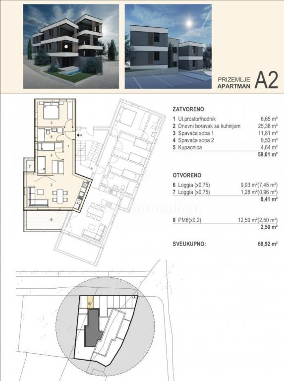 PRIZEMLJE - A2 (ulazni prostor / hodnik, dnevni boravak + kuhinja, dvije spavaće sobe, kupaonica, dvije lođe, parkirno mjesto) - 68,92 m² - 241.220 EUR