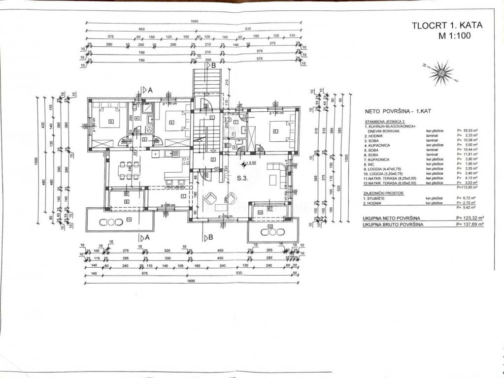 U visokom prizemlju (visina 1.kata s južne strane) se nalaze dva stana, oba su dvosobna s dnevnim boravkom i velikim balkonima s pogledom na more. Na 1.i 2.katu se nalaze stanovi preko cijele etaže s tri spavaće sobe, dvije kupaonice, toaletom, kuhinjom i blagovaonicom, dnevnim boravkom i dvije terase.