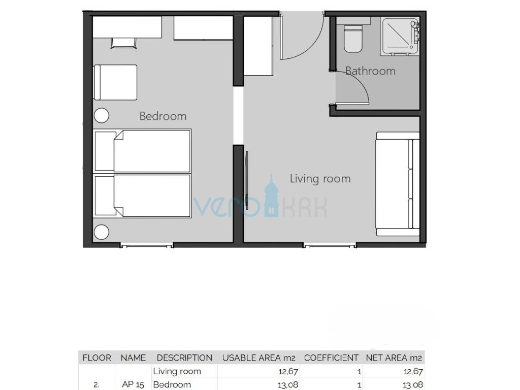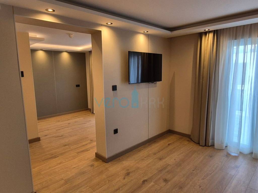 Apartman ukupne površine 28,86 m2 nalazi se na drugome katu višestambene zgrade sa liftom. Sastoji se od ulaza, mini kuhinje sa dnevnim boravkom, kupaonice i sobe. U gradnji je korištena vrhunska oprema i materijali: pametni sustav, digitalno upravljanje grijanjem, hlađenjem, kpl rasvjetom, bojlerom i kupaonskim radijatorima putem mobilne aplikacije ili jedinice u apartmanu, ugrađeni su senzori za otvorene prozore i vrata, video nadzor zgrade. kupaonski namještaj od Keroka, keramika polirani gres, sanitarije mat bijele boje sa detajlima, spušteni knauf stropovi s ugrađenom i indirektnom rasvjetom, protuprovalna vrata Dierre (IT), unutarnja vrata od lakiranog medijapana sa skrivenim pantima...