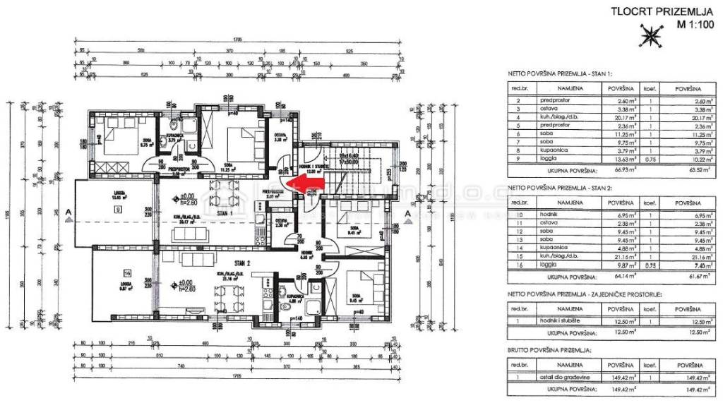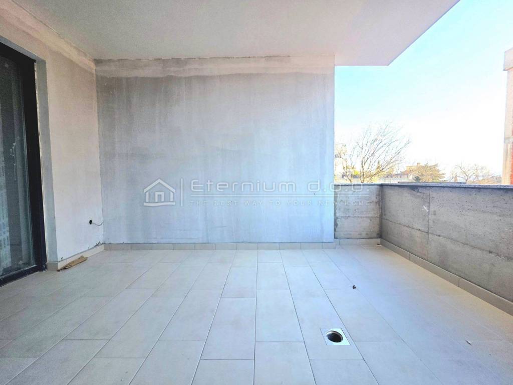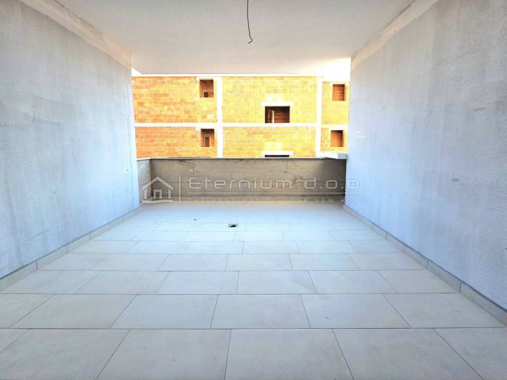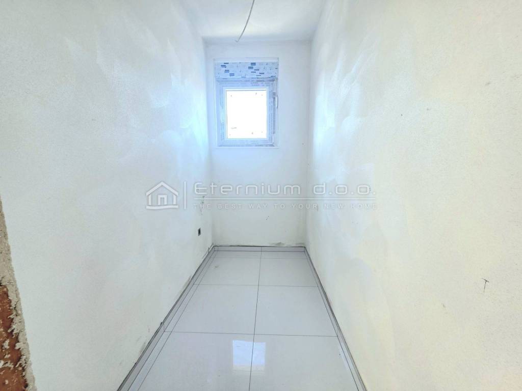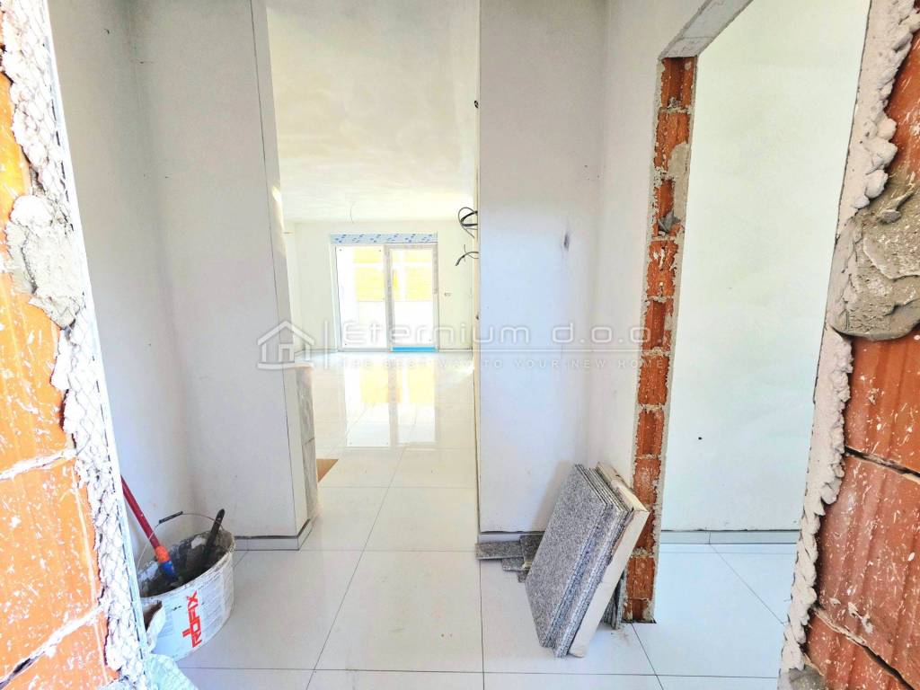 Već smo rekli da se stan nalazi u prizemlju, a sastoji se od predulaza odnosno manjeg ulaznoga hodnika, spremišta, open space dnevnoga dijela kojega čine kuhinja sa blagovaonom i dnevni boravak, te spavaćega dijela kojega čine 2 spavaće sobe i kupaona. Iz dnevnoga dijela se izlazi na natkrivenu loggiu površine 13,5m2. Kako je navedeno, stan ima ukupnu površinu od 67m2, dok je prodajna površina 63,50m2 zbog koeficijenta kojim se računa loggia.
