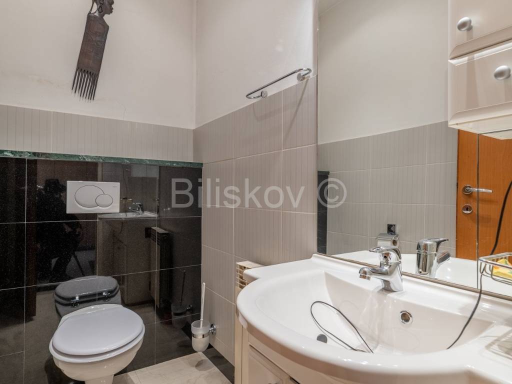 - U prizemlju je garsonjera od 28,82m2, koja može služiti kao izvor prihoda od iznajmljivanja, ured i slično. Ona ima pristup zelenoj površini (cca 50m2), koja pripada stanu.