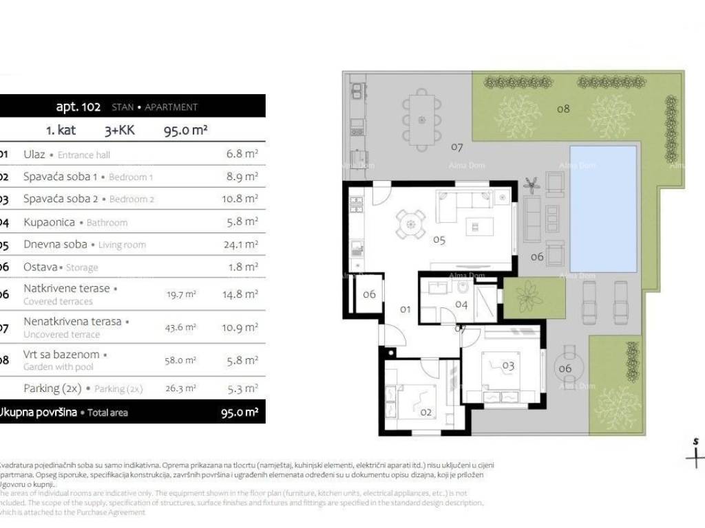 Objekt je izgrađen u skladu s najvišim standardima moderne gradnje. Stan 101 ima zaseban ulaz, maksimalnu privatnost i prostrani ograđeni vrt s bazenom idealan za odmor, obitelj ili turističku investiciju.