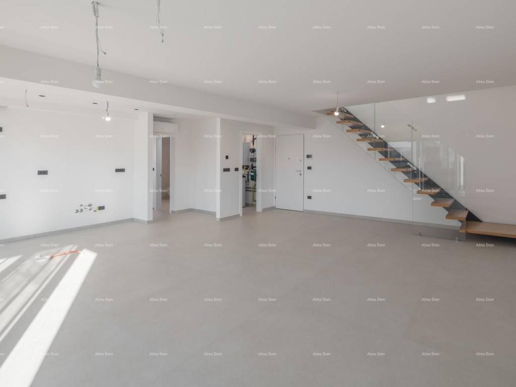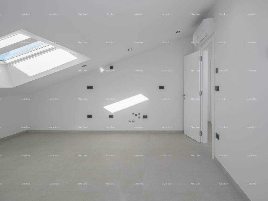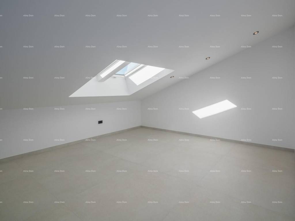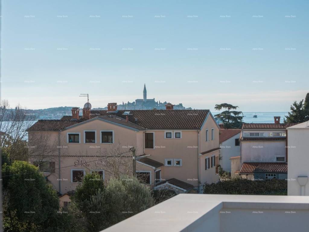 Unutarnje stepenice vode na drugu etažu gdje se nalaze još dvije spavaće sobe, kupatilo i velika krovna terasa sa koje pruža pogled na more i Rovinj.