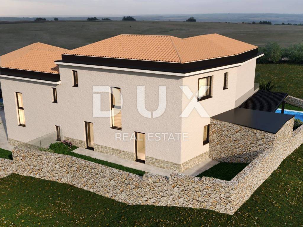 Ovaj posebni dvojni objekt nalazi se u lijepom mjestu na otoku Krku. Smjestio se na uzvisini iznad mora s predivnim pogledom na njega. Ima 172 m2 i dvije etaže. U prizemlju su se smjestili ulazni hodnik, velika izba, kupaonica, tehnička soba, kuhinja s blagovaonicom i veliki dnevni boravak iz kojeg se izlazi na uređenu okućnicu s bazenom, sunčalištem i spremištem. Na katu se nalaze tri spavaće sobe svaka sa svojom kupaonicom te izlazom na balkon. Objekt ima dva parkirna mjesta.