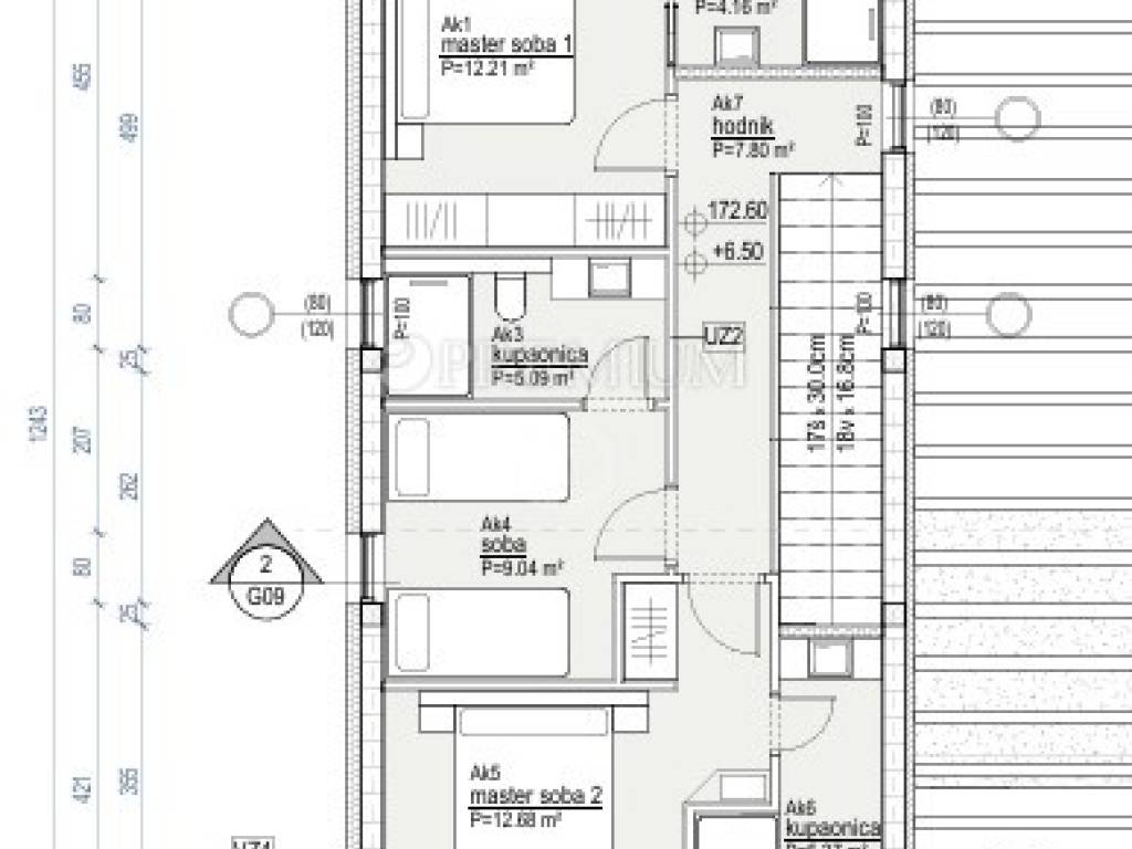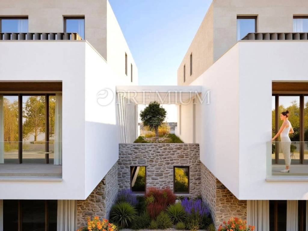 Na prvom katu smještene su tri spavaće sobe, svaka s vlastitom kupaonicom, dok dvije sobe imaju izlaz na balkon. Unutarnjim stepeništem dolazi se u prizemlje gdje se nalazi hodnik, gostinjski wc, spremište te prostrani open space dnevni boravak s kuhinjom i blagovaonom, s izlazom na natkrivenu terasu.