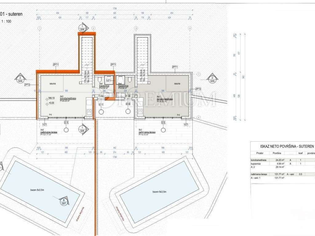 U suterenu se nalazi dodatna kupaonica, konoba odnosno wellness prostor sa saunom, s izlazom na natkrivenu terasu i okućnicu na kojoj je predviđen bazen dimenzija 8 x 3,5 m.