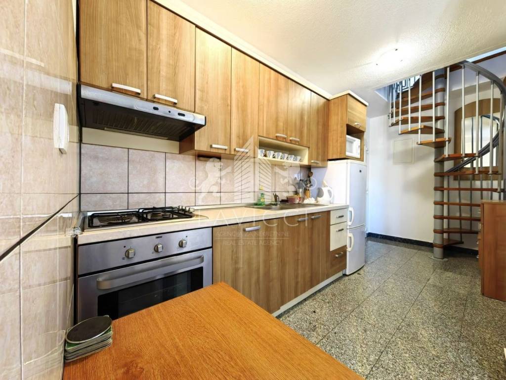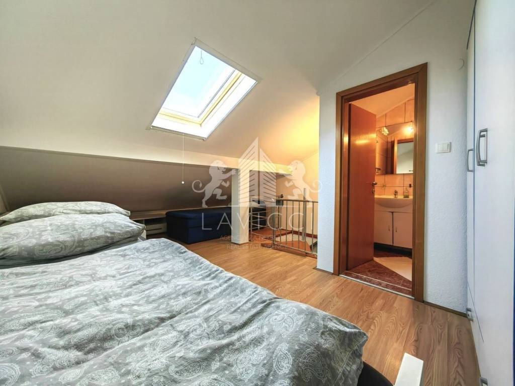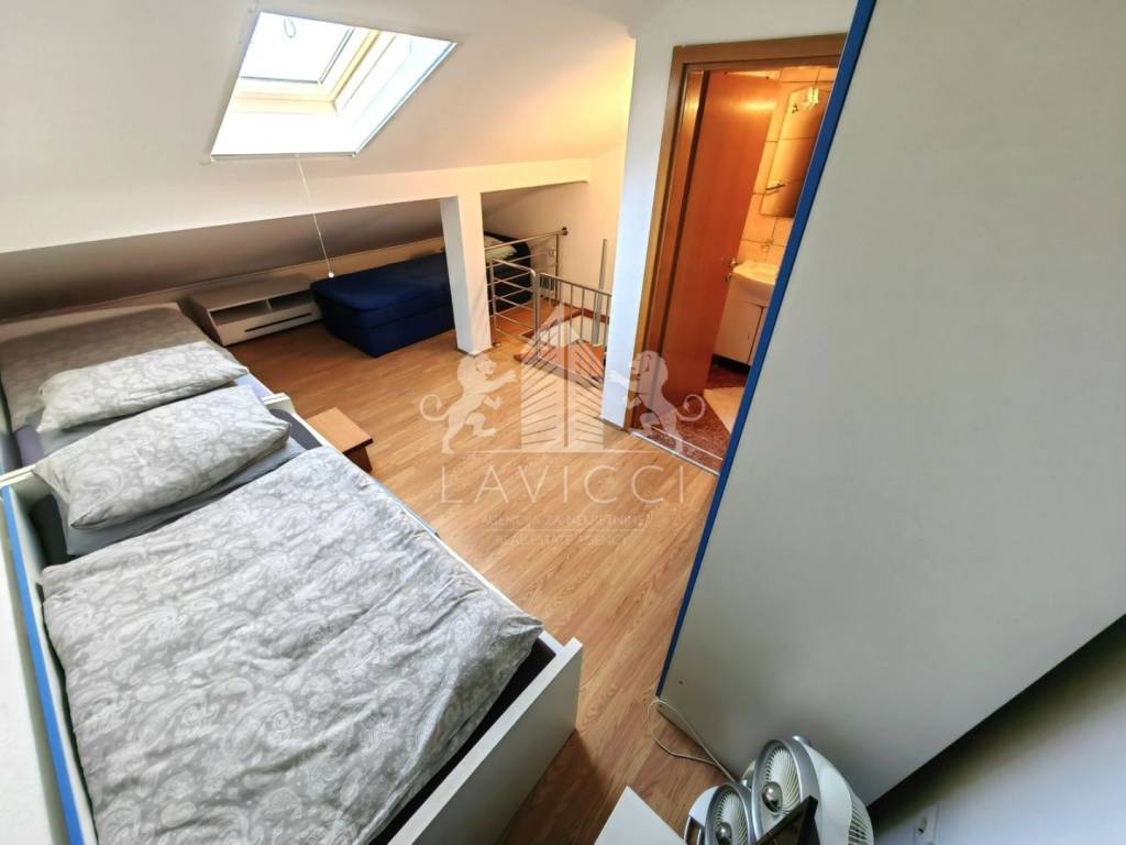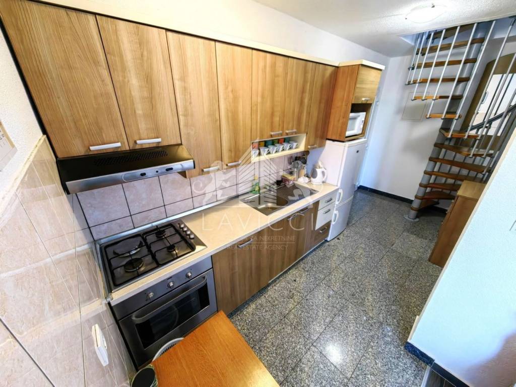 Apartman ukupne neto površine 58 m² (67,40 m² tlocrtno) raspoređen je na dvije etaže. Donji dio sastoji se od ulaznog prostora, dnevnog boravka s kuhinjom i blagovaonicom, kupaonice s WC-om, spavaće sobe i balkona, dok unutarnje stepenice vode u potkrovlje gdje se nalazi dodatna spavaća soba s vlastitom kupaonicom.