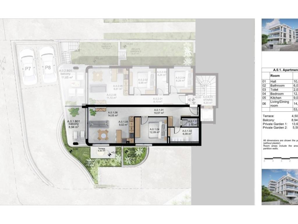 Sastoji se od udobne spavaće sobe, kupaonice, dodatnog toaleta, hodnika te otvorenog koncepta kuhinje, blagovaonice i dnevnog boravka. Iz dnevnog boravka izlazi se na prostrani balkon površine 8,94 m, kao i na dodatnu terasu od 4,50 m te uređeni vrt od 13,60 m, koji pruža idealan prostor za opuštanje i druženje. Spavaća soba također ima direktan izlaz u vlastiti, intimni vrt površine 5,59 m, što dodatno doprinosi osjećaju privatnosti i komfora.