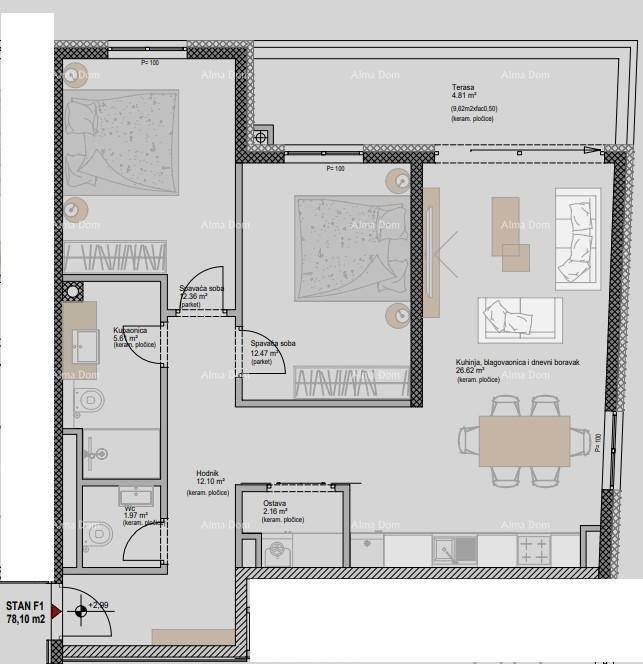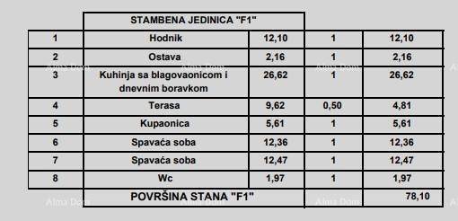 Stan se nalazi na 1 katu zgrade s 4 etaže. Sastoji se od ulaznog hodnika, dnevnog boravka s kuhinjom i blagavaonom, 2 spavaće sobe, kupaone, WC, ostave i terase.