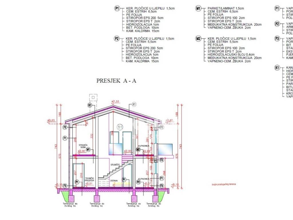 Što se tiče grijanje, biti će postavljena predispozicija za podno grijanje na toplinsku pumpu dok je hlađenje na klima jedinice. Površina bazena je 26 m2. Između kuća će biti postavljena ograda.