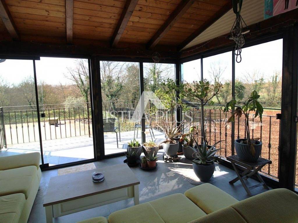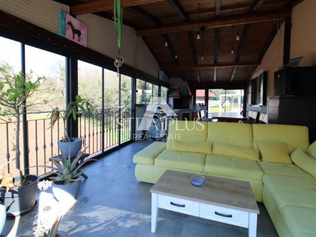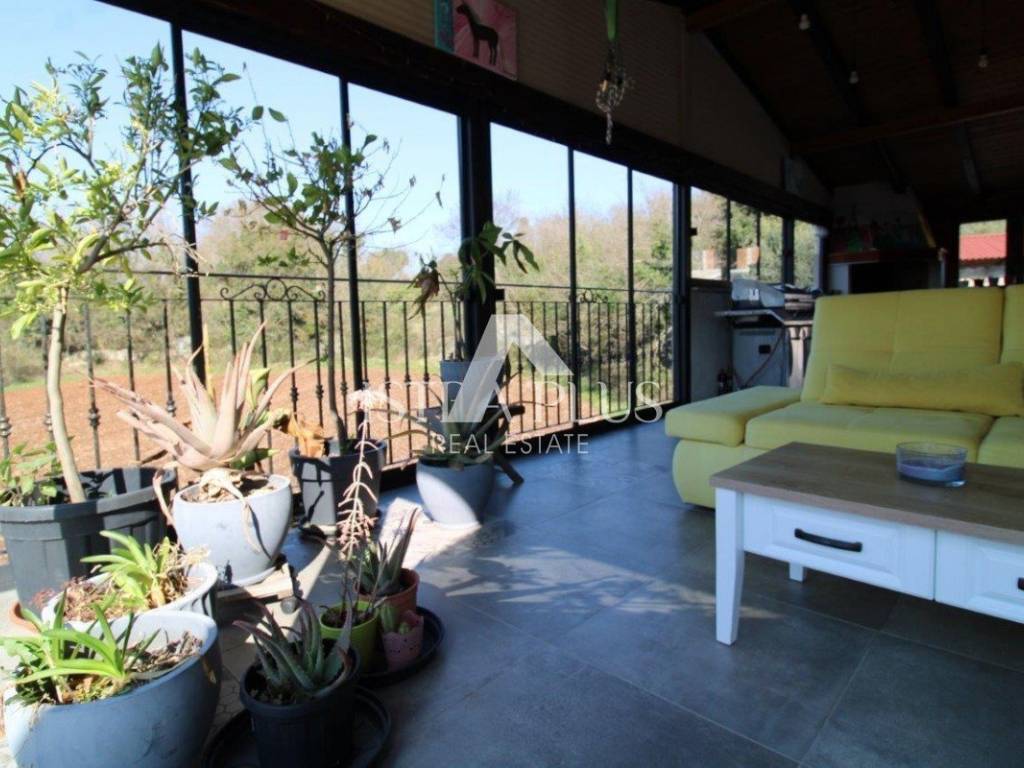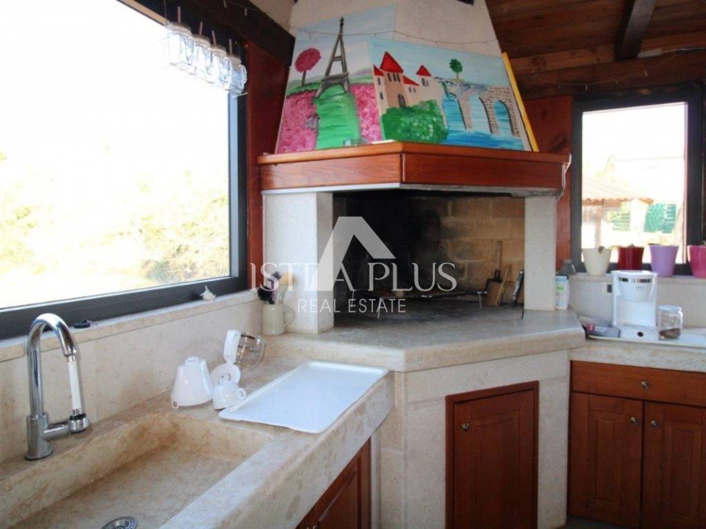Kuća raspolaže prekrasnom ljetnom kuhinjom, koja je ostakljena i spaja se sa prirodom, tu je mjesto za ugodan boravak velika druženja, i kuhanje na pravom zidanom kaminu . centralno grijanje- na peć na drva- povezano sa centralnim grijanjem i radijatorima za cijelu kuću.