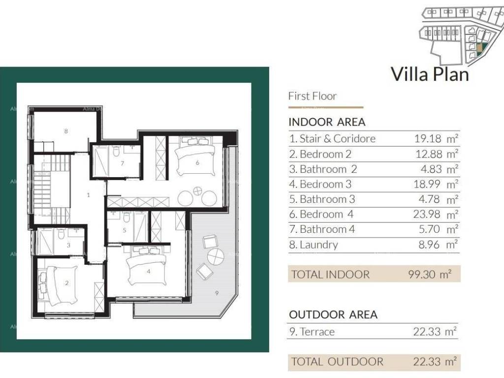 Na prvi kat se ide stepenicama i sastoji se od hodnika, 3 spavaće sobe, 3 kupatila, ostava i terase.