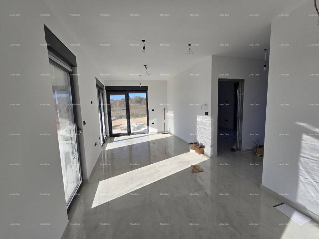 Ova lijepa i moderna samostojeća kuća nalazi se na mirnijoj lokaciji, okružena zelenilom, samo 5 minuta autom od centra Žminja.