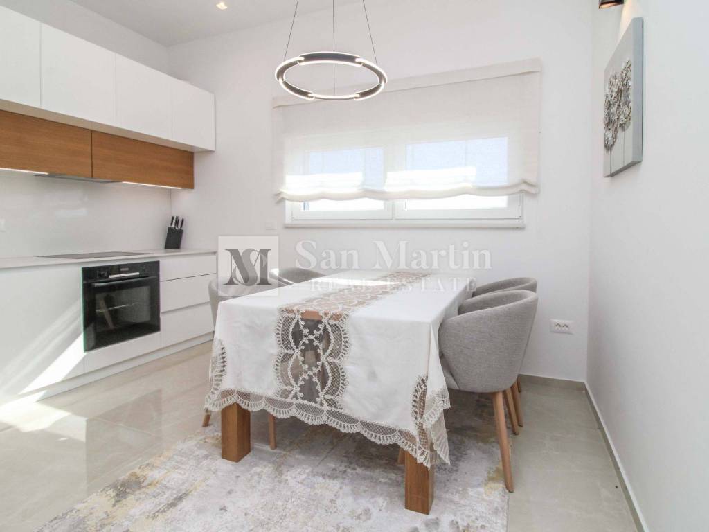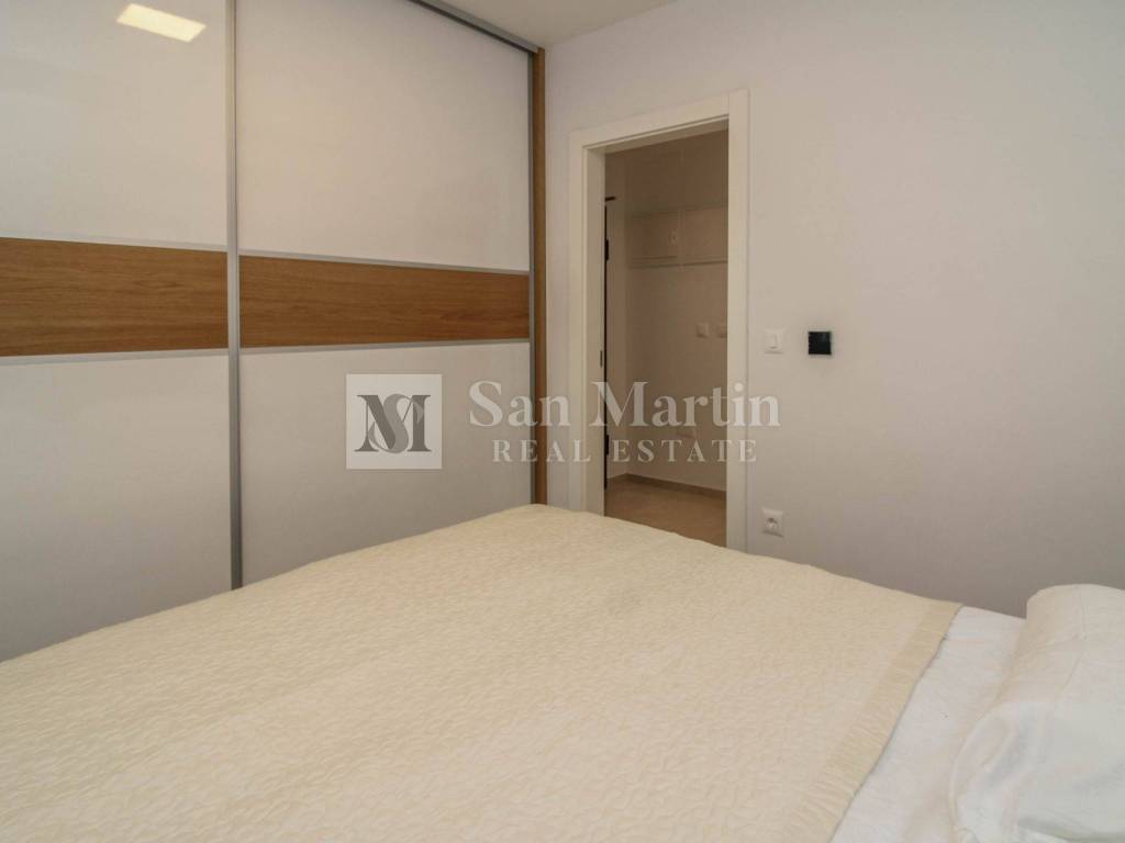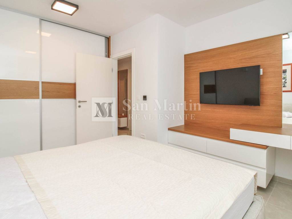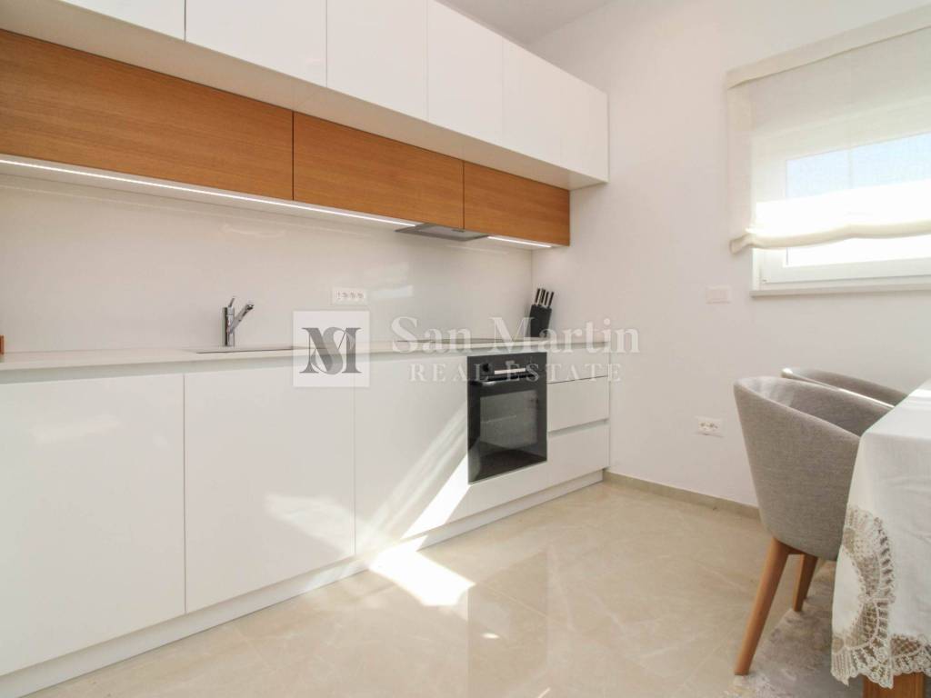 Stan se nalazi na prvom katu kvalitetne novogradnje te nudi 76 m stambene površine (bez terasa). Sastoji se od dvije komforne spavaće sobe, prostranog dnevnog boravka povezanog s kuhinjom i blagovaonicom te praktičnog spremišta unutar stana. Poseban dojam prostranosti dodatno naglašavaju visoki stropovi.