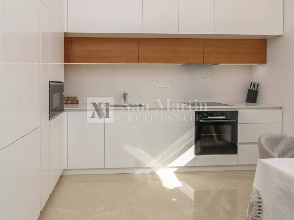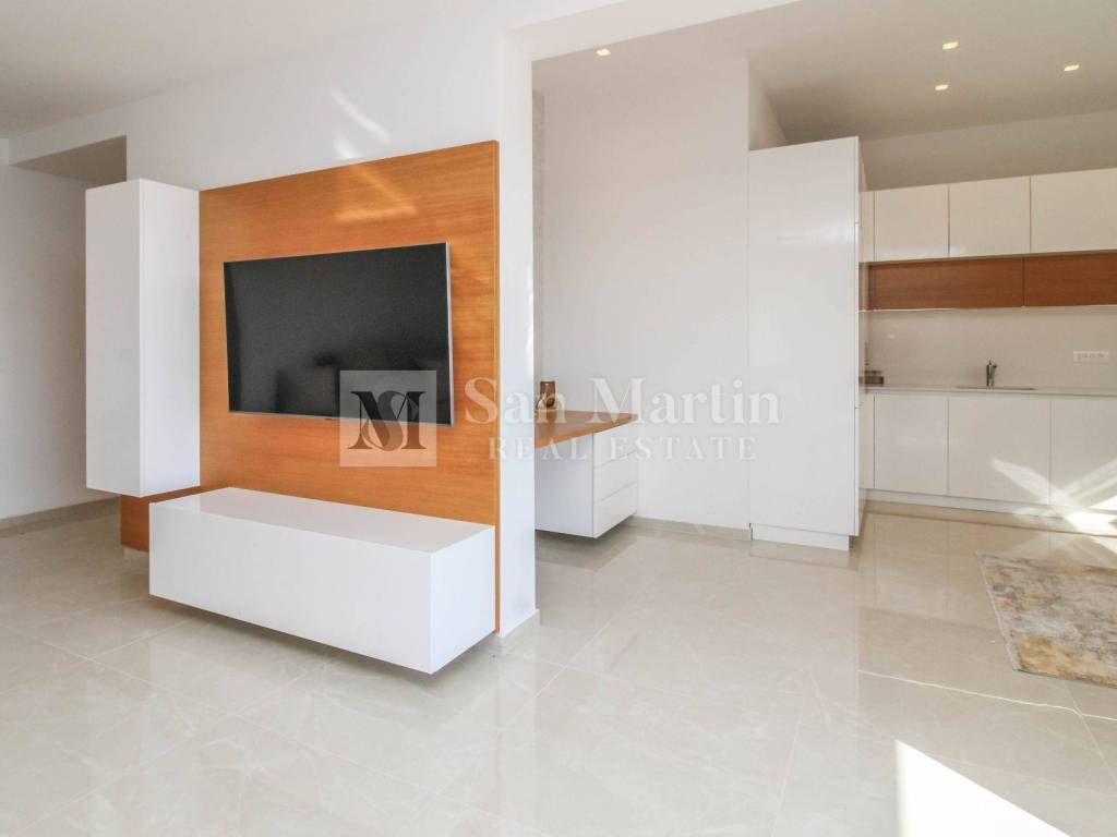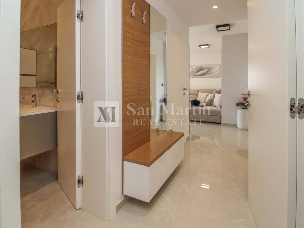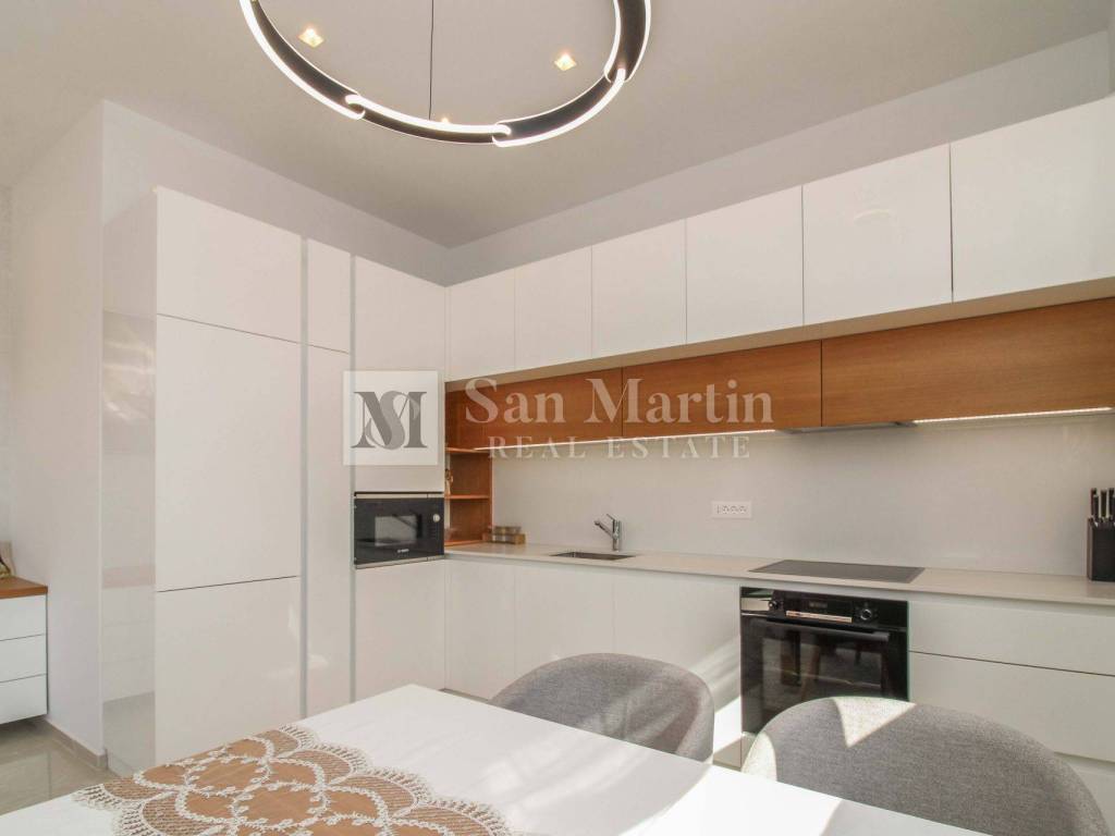 Stan se nalazi na prvom katu kvalitetne novogradnje te nudi 76 m stambene površine (bez terasa). Sastoji se od dvije komforne spavaće sobe, prostranog dnevnog boravka povezanog s kuhinjom i blagovaonicom te praktičnog spremišta unutar stana. Poseban dojam prostranosti dodatno naglašavaju visoki stropovi.