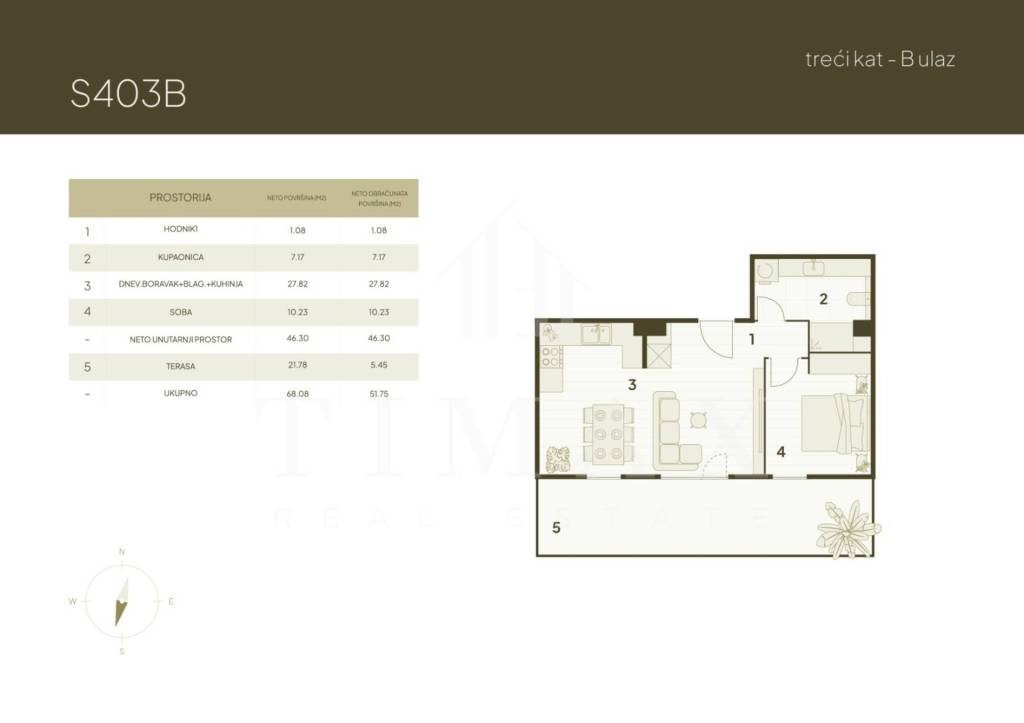 PROJEKT BOTINEC - Dvosoban stan S403B na trećem katu, 51,75 m2
