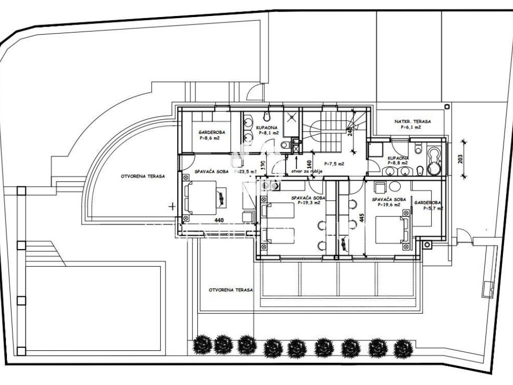 Na prvome katu smještene su tri spavaće sobe sa vlastitim kupaonama i izlazom na terasu.