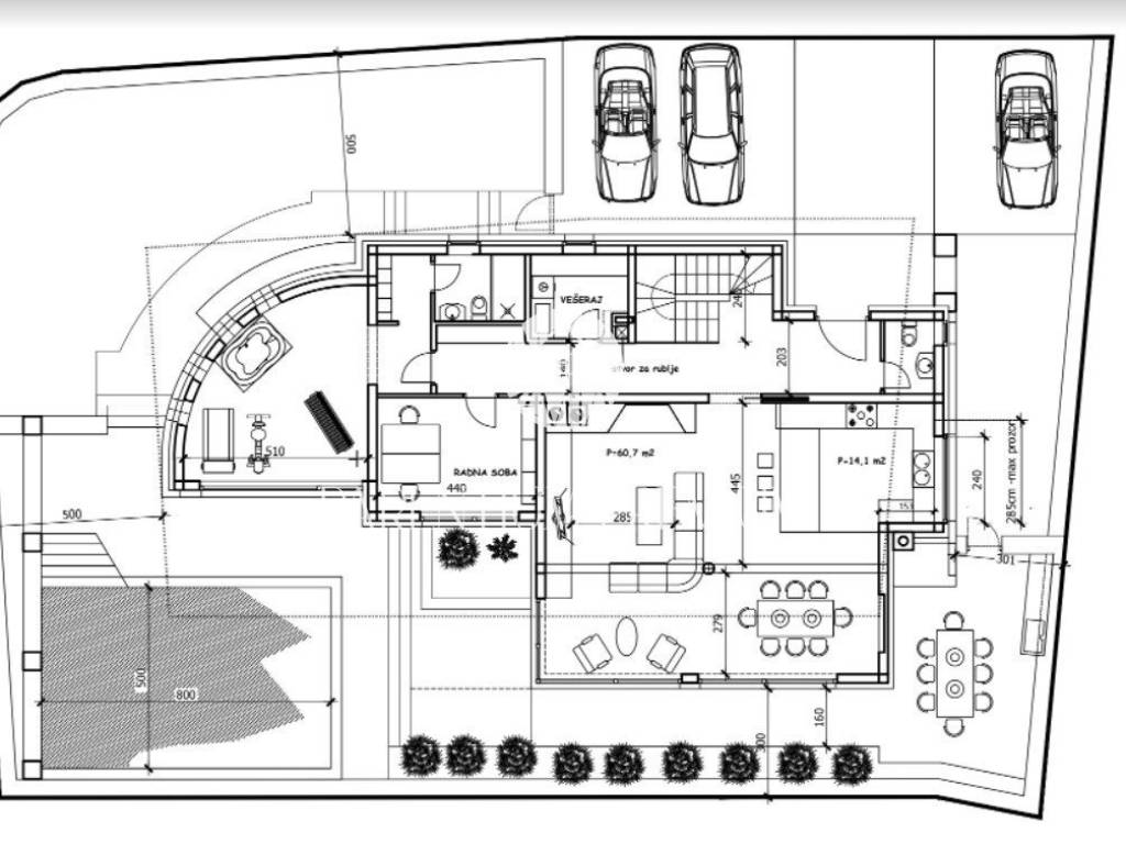 Iz dnevnog boravka i kuhinje moguć je izlaz na bazen i terase gdje se nalazi veliki stol za objedovanje i roštilj.