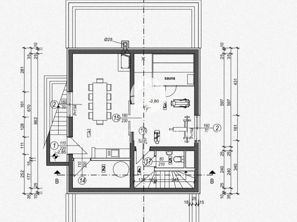 U podrumu se nalazi strojarnica, taverna sa kaminom i kuhinjom, te relax zona gdje su smješteni sauna i prostor za fitnes.