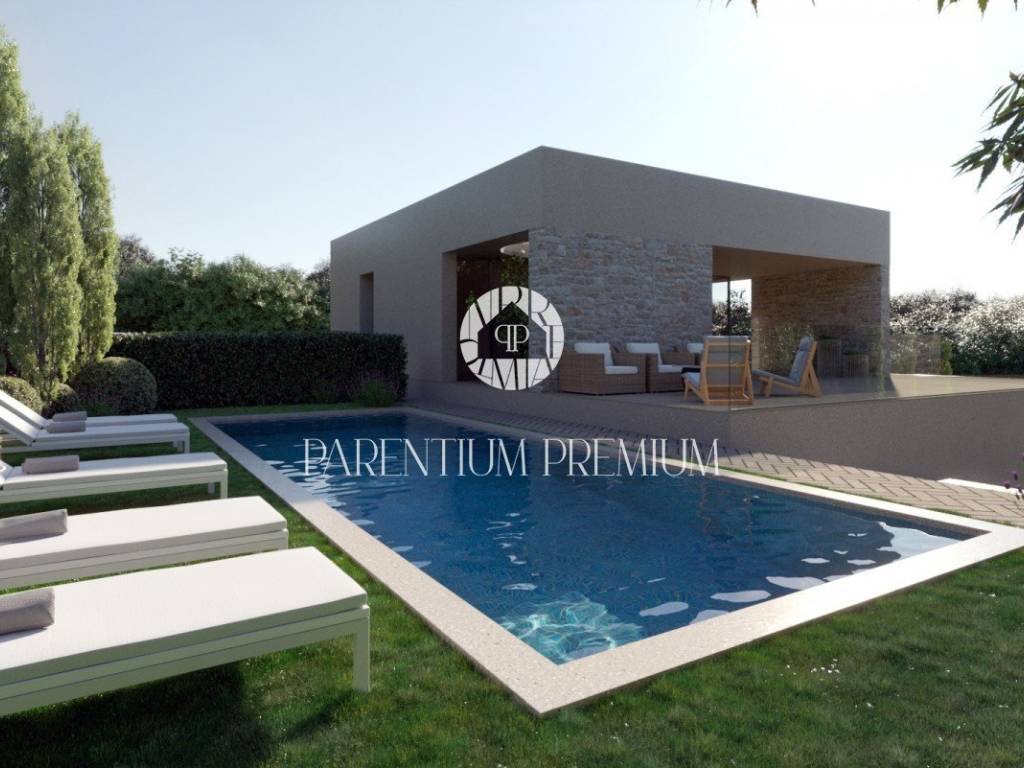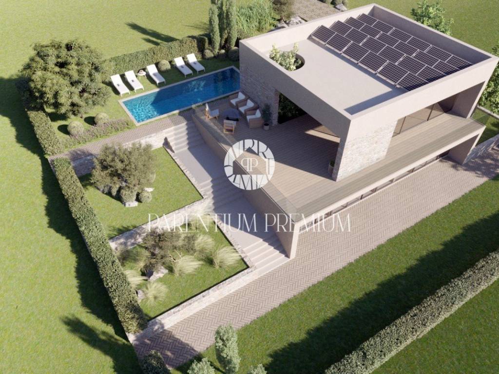 Moderna novogradnja u srcu Istre, smještena u Trvižu, 11 km od Pazina, ekološki opremljena sa vlastitim izvorom električne energije iz solarnih panela i električnim podnim grijanjem. Zbog kosine terena na kojem se nalazi kuća, panoramski pogled je očaravajući, pa su dnevni prostori (dnevni boravak, kuhinja i blagovaonica) smješteni u prizemlju u koje se ulazi s razine parkirališta, a spavaće sobe s wc-ima se nalaze na prvom katu. Prostrana okućnica s bazenom omogućuje uživanje u ljepoti prirode, a blizina najljepših istarskih gradića osigurava dobru prometnu povezanost s ostatkom poluotoka. Nekretnina je idealna za obiteljski život ili turističko korištenje.