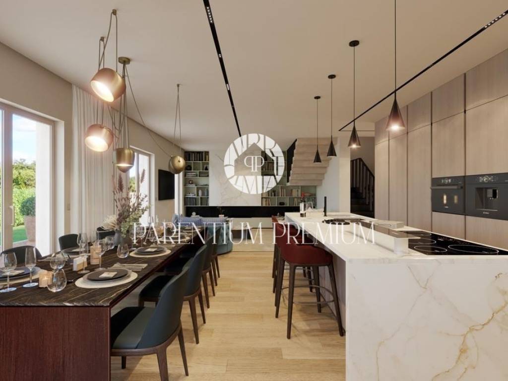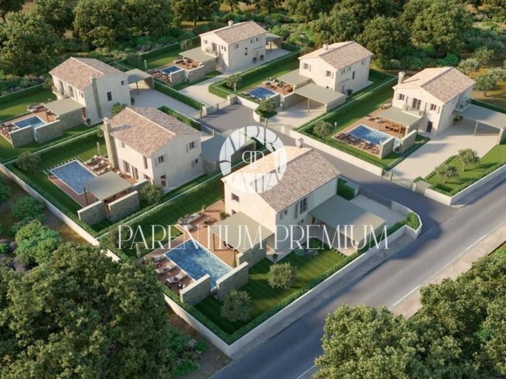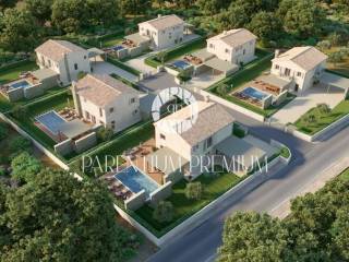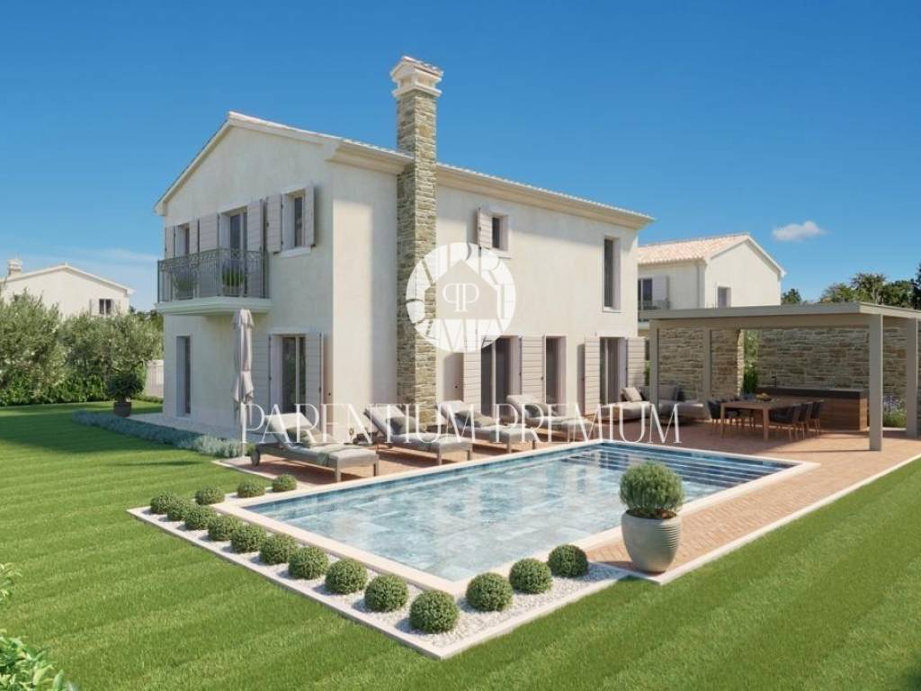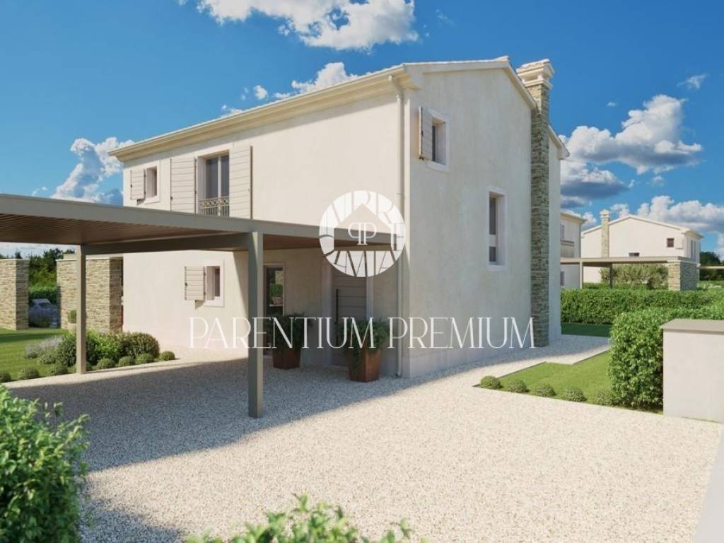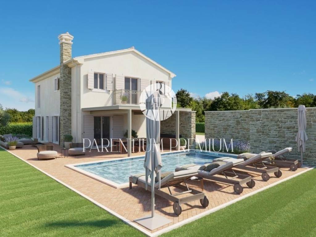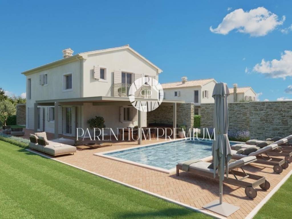 Ova prekrasna vila s bazenom smještena je na mirnoj lokaciji nedaleko od Motovuna i 15km od Poreča i Novigrada. Prostire se na 900m2 zemljišta te 150m2 stambene površine. Veličina bazena je 42m2. Projekt uključuje 6 vila s privatnim bazenima i besprijekorno uređenim okućnicama. Vili pripadaju 2 natkrivena parkirna mjesta. U prizemlju kuće nalazi se kuhinja s blagovaonicom i dnevni boravak open space koncepta s izlazom na terasu te gostinjski wc. Prvi kat se sastoji od 3 spavaće sobe, svaka sa svojom kupaonicom i 2 terase. Sustav grijanja je dizalica topline s vodenim podnim grijanjem i ventilatorskim konvektorima za grijanje i hlađenje, kao i centralni vodospremnik od 300 l za grijanje bazena. Bazenska tehnika i dezinfekcija vode su na principu elektrolize. Satelitski TV sustav i IP TV. U spavaćim sobama postavljen je vrhunski talijanski drveni parket, a u ostalim sobama kvalitetna keramika. Stolarija i škure aluminijski. Automatska električna kapija s daljinskim upravljanjem. Sustav video nadzora i kamera sa uprevljanjem preko smartphonea. Parcela je ograđena betafence ogradom i parapetnim zidom uz koji je posađena živa ograda (fotinija) i trava te je postavljen automatski sustav navodnjavanja sa timerom i senzorima za kišu. Vila se prodaje nenamještena uz mogućnost kompletnog opremanja, od namještaja do ručnika, uz dodatnu naknadu. Osim kvalitetne opreme i savršenog izgleda, ova vila je i zbog mirne lokacije idealna za obiteljski život ili turističko iznajmljivanje.