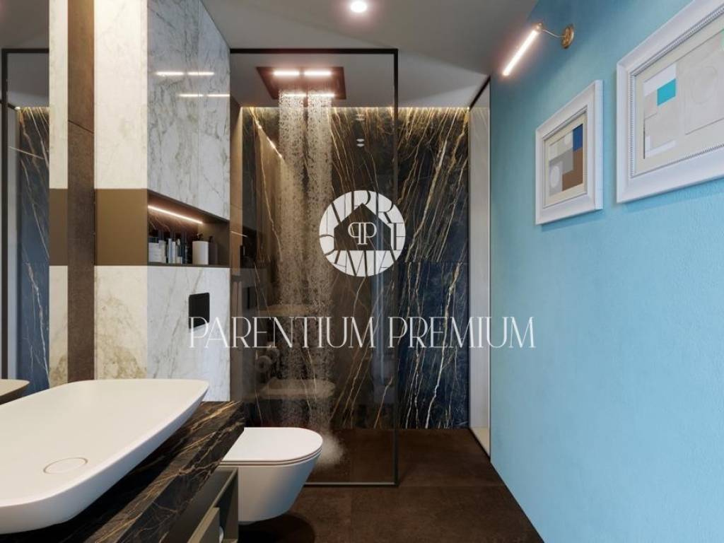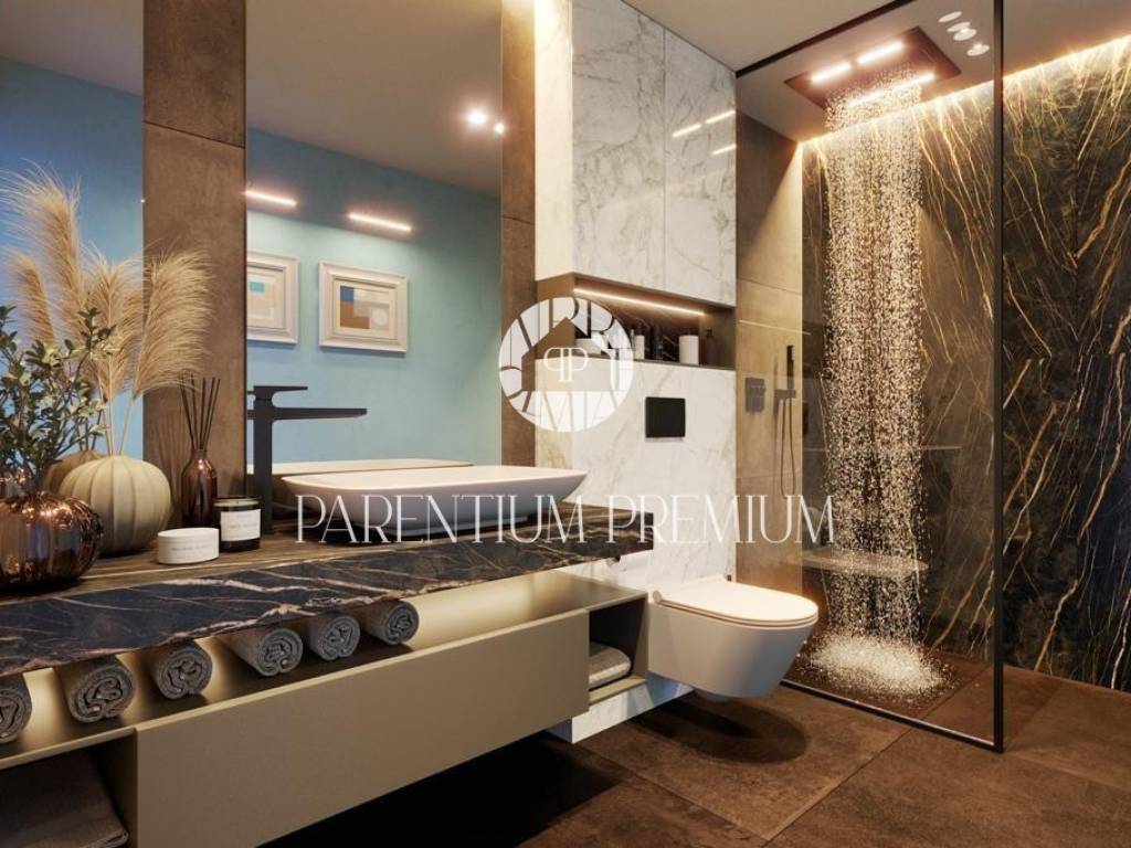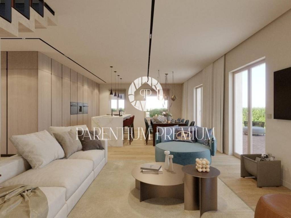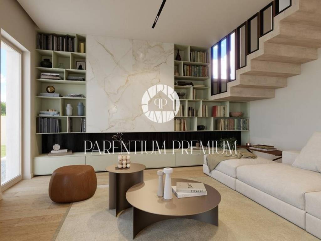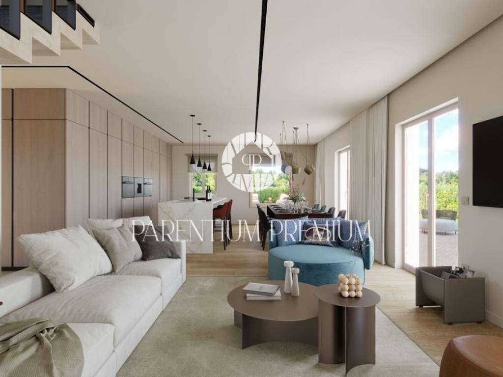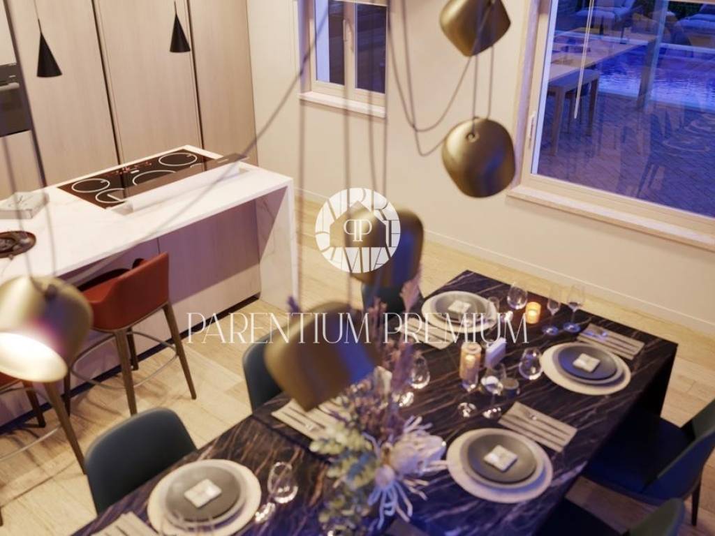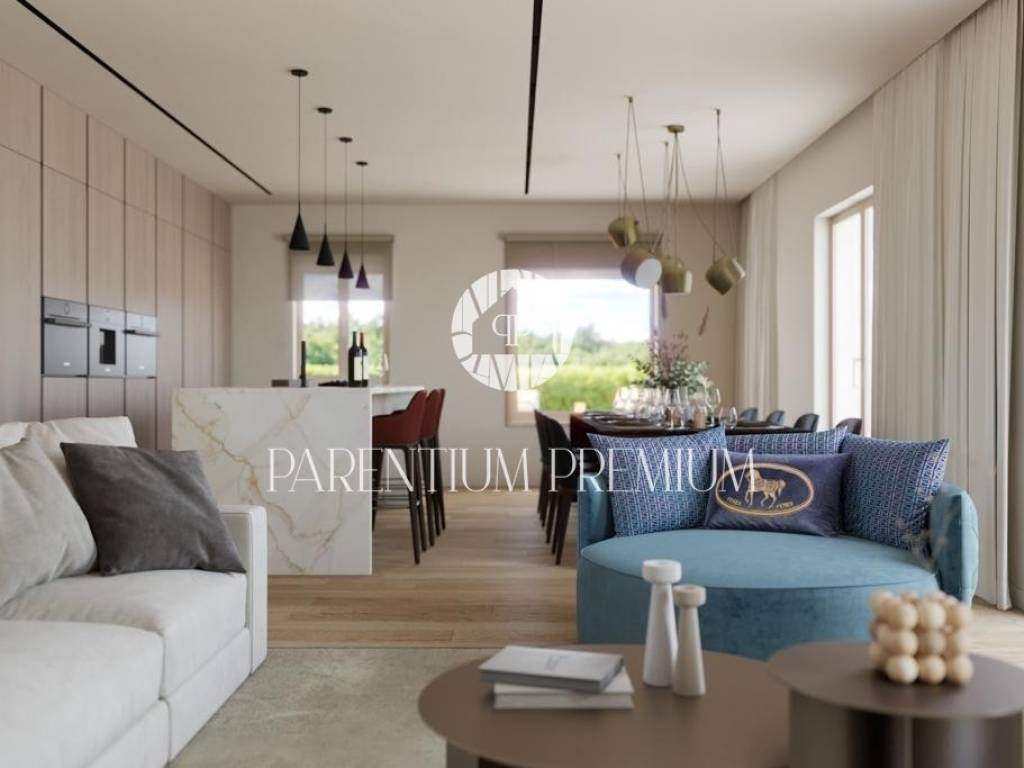 Ova prekrasna vila s bazenom smještena je na mirnoj lokaciji nedaleko od Motovuna i 15km od Poreča i Novigrada. Prostire se na 900m2 zemljišta te 150m2 stambene površine. Veličina bazena je 42m2. Projekt uključuje 6 vila s privatnim bazenima i besprijekorno uređenim okućnicama. Vili pripadaju 2 natkrivena parkirna mjesta. U prizemlju kuće nalazi se kuhinja s blagovaonicom i dnevni boravak open space koncepta s izlazom na terasu te gostinjski wc. Prvi kat se sastoji od 3 spavaće sobe, svaka sa svojom kupaonicom i 2 terase. Sustav grijanja je dizalica topline s vodenim podnim grijanjem i ventilatorskim konvektorima za grijanje i hlađenje, kao i centralni vodospremnik od 300 l za grijanje bazena. Bazenska tehnika i dezinfekcija vode su na principu elektrolize. Satelitski TV sustav i IP TV. U spavaćim sobama postavljen je vrhunski talijanski drveni parket, a u ostalim sobama kvalitetna keramika. Stolarija i škure aluminijski. Automatska električna kapija s daljinskim upravljanjem. Sustav video nadzora i kamera sa uprevljanjem preko smartphonea. Parcela je ograđena betafence ogradom i parapetnim zidom uz koji je posađena živa ograda (fotinija) i trava te je postavljen automatski sustav navodnjavanja sa timerom i senzorima za kišu. Vila se prodaje nenamještena uz mogućnost kompletnog opremanja, od namještaja do ručnika, uz dodatnu naknadu. Osim kvalitetne opreme i savršenog izgleda, ova vila je i zbog mirne lokacije idealna za obiteljski život ili turističko iznajmljivanje.