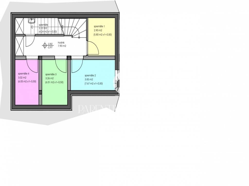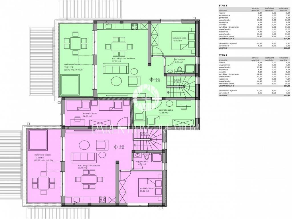 Prodaje se odličan luksuzni dvoetažni stan s prostranom terasom i jaccuzijem nedaleko od grada Poreča. STAN 3 (TLOCRT ZELENE BOJE) Stan se nalazi na mirnoj lokaciji u novoizgrađenoj stambenoj zgradi u kojoj se nalazi 4 stana. Dvoetažni stan se nalazi na prvom i drugom katu. Na prvom katu se nalazi ulazni hodnik, vešeraj sa WC-om, prostorija za garderobu ili neku drugu namijenu, te jedna spavaća soba sa svojom kupaonicom. U hodniku stepenice vode na drugi kat. Na drugom katu se nalaze dvije spavaće sobe, jedna kupaonica i veliki dnevni boravak s kuhinjom i blagovaonom, iz kojeg se izlaz na terasu koja pruža predivan panoramski pogled na more. Na terasi su napravljeni priključci za jacuzzi. U dnevnom boravku i kupaonama je podno grijanje i a u spavaćim sobama se nalaze klima uređaji. Stanu pripada jedno parkirno mjesto ispred zgrade, a uz nadoplatu se može kupiti još jedno. Na parkingu ima priključak za električni punjač za aute. U podrumu zgrade se nalazi spremište od 6.51m2. Ovaj stan je idealno rješenje stambenog pitanja ili kao investicija u turističke svrhe.