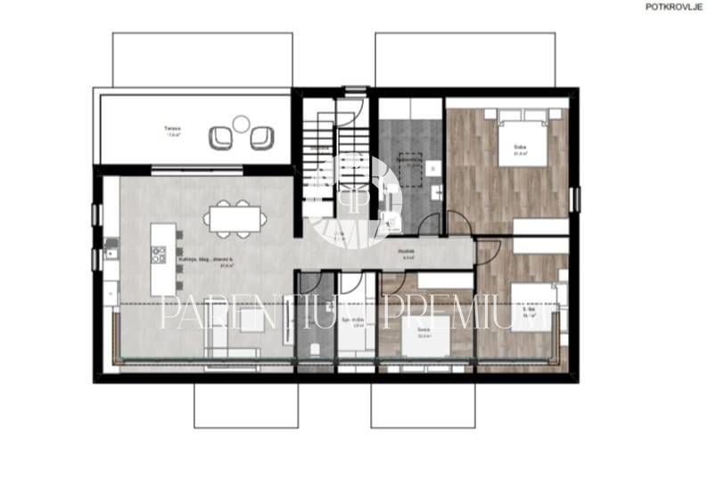 Na samo 2,5 km udaljenosti od uređenih plaža grada Poreča, smjestio se ovaj moderni penthouse ukupne površine od 149m2.
