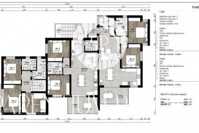 Krovna terasa od 75m2 koja će biti prohodnog tipa, moći će se urediti po izboru sa predviđenim instalacijama za postavljanje jaccuzzija i ljetne kuhinje te pergole za zaštitu od sunca.