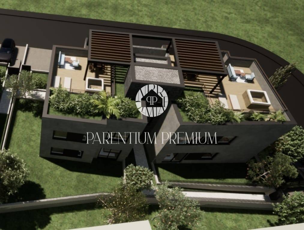 Stan se sastoji od ulaznog hodnik sa garderobom koji nas vodi u prostrani dnevni prostor gdje se nalaze dnevni boravak i kuhinja sa blagovaonom otvorenog tipa. Kroz cijeli dnevni prostor postavljene su staklene stijene koje omogućavaju veliki dotok svijetlosti. Iz dnevnog dijela izlazi se na terasu koja je natkrivena te prekrasno uređeno dvorište ukupne površine od 99,82m2. U dvorištu se se može napraviti ljetna kuhinja te postaviti jacuzzi za uživanje i relaksaciju uz djelomični pogled na more. U stanu su još smještene 3 spavaće sobe od kojih jedna ima vlastitu kupaonu, te još jedna dodatna kupaona za preostale 2 spavaće sobe.