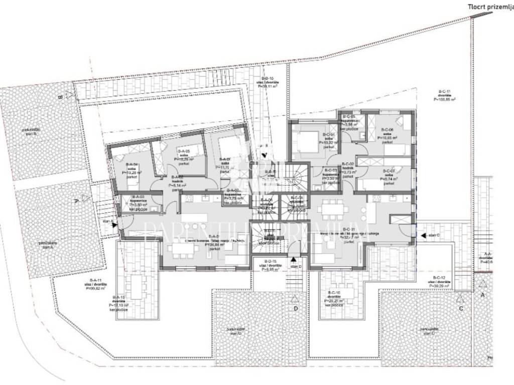 Stanu pripadaju 2 parkirna mjesta u dvorištu koja će biti spojena stazom prema zasebnom ulazu koji će koristiti samo ovaj stan dajući novim vlasnicima privatnost i mir te odvojenost od drugi stanara ove fenomenalne zgrade.