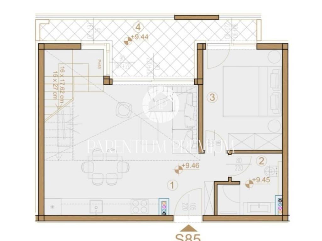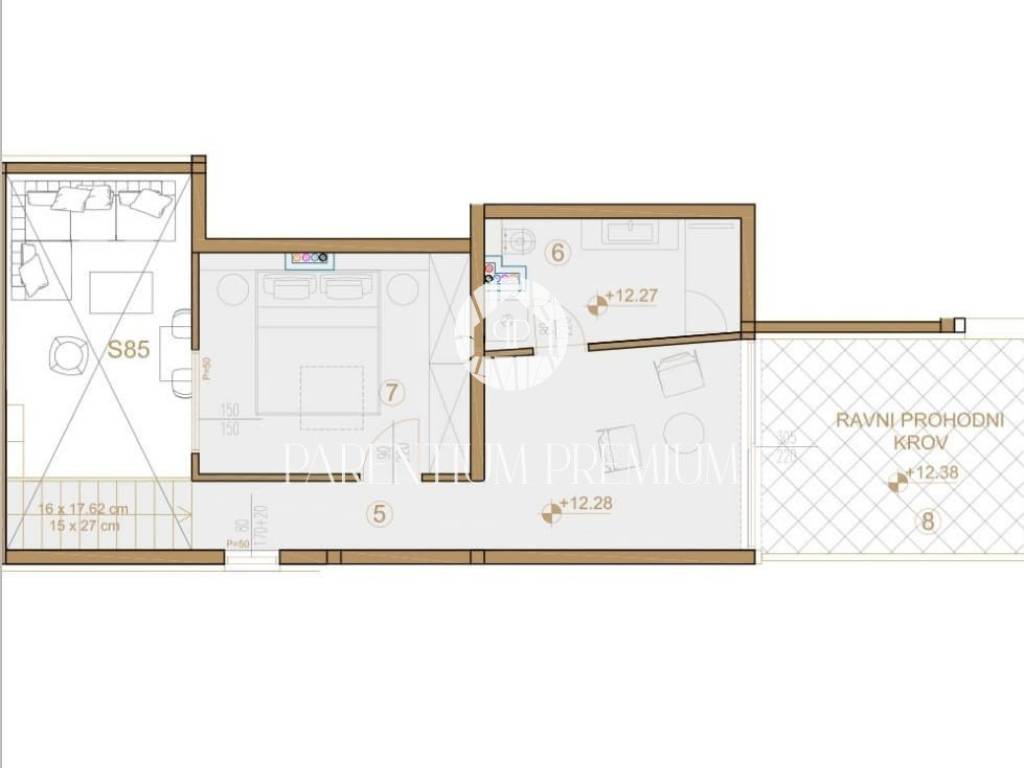 Apartman S85, ukupne površine 90,29m2 je dvoetažni Penthause Apartman u PREMIUM BLUE ZONI sa galerijom i pogledom na more i grad Poreč.